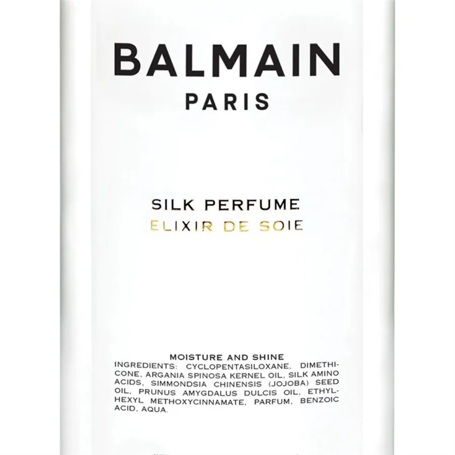 Balmain Hair Silk Perfume je vyživujúci vlasový sprej, ktorý zanecháva vlasy hebké a zamatovo jemné na dotyk. Jeho zloženie je obohatené o čistý arganový olej a hodvábny proteín, ktoré podporujú hydratáciu a pomáhajú vlasom udržiavať optimálnu vlhkosť. Tieto zložky chránia poškodené, suché a oslabené vlasy pred vonkajšími vplyvmi a dodávajú im dlhotrvajúci hodvábny lesk.