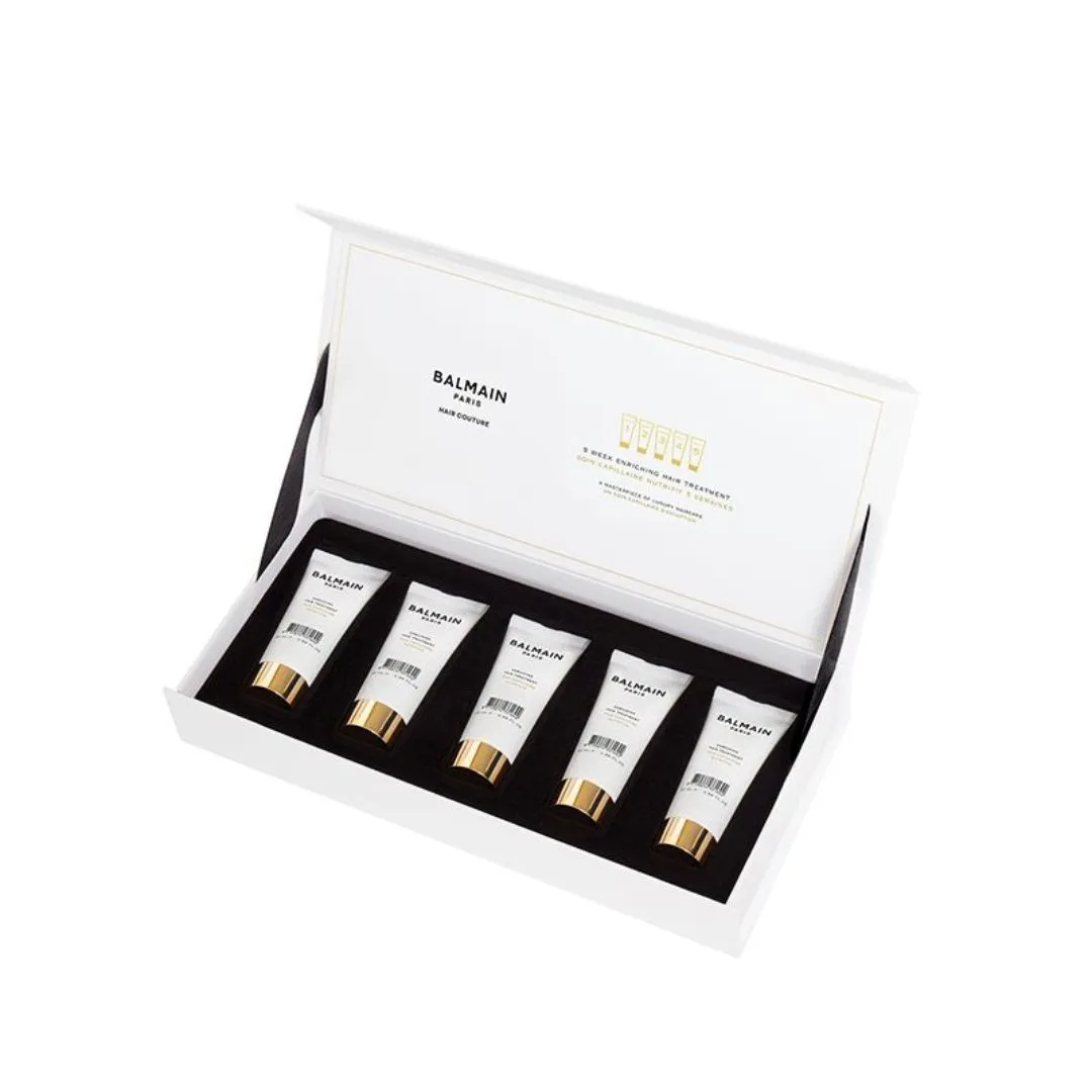 Balmain Paris Hair Couture s hrdosťou dopĺňa svoju ošetrujúcu kolekciu o 5-týždňovú obohacujúcu vlasovú kúru, ktorú vytvorili odborníci na regeneráciu a posilnenie vlasov v priebehu piatich týždňov. Jemná krémová starostlivosť s ľahučkým zložením obnovuje mladistvý a žiarivý vzhľad vlasov. Udržiava pokožku hlavy v prirodzenej rovnováhe a zároveň uzatvára vlasové kutikuly, dodáva objem a pružnosť a obnovuje vlasové vlákna.