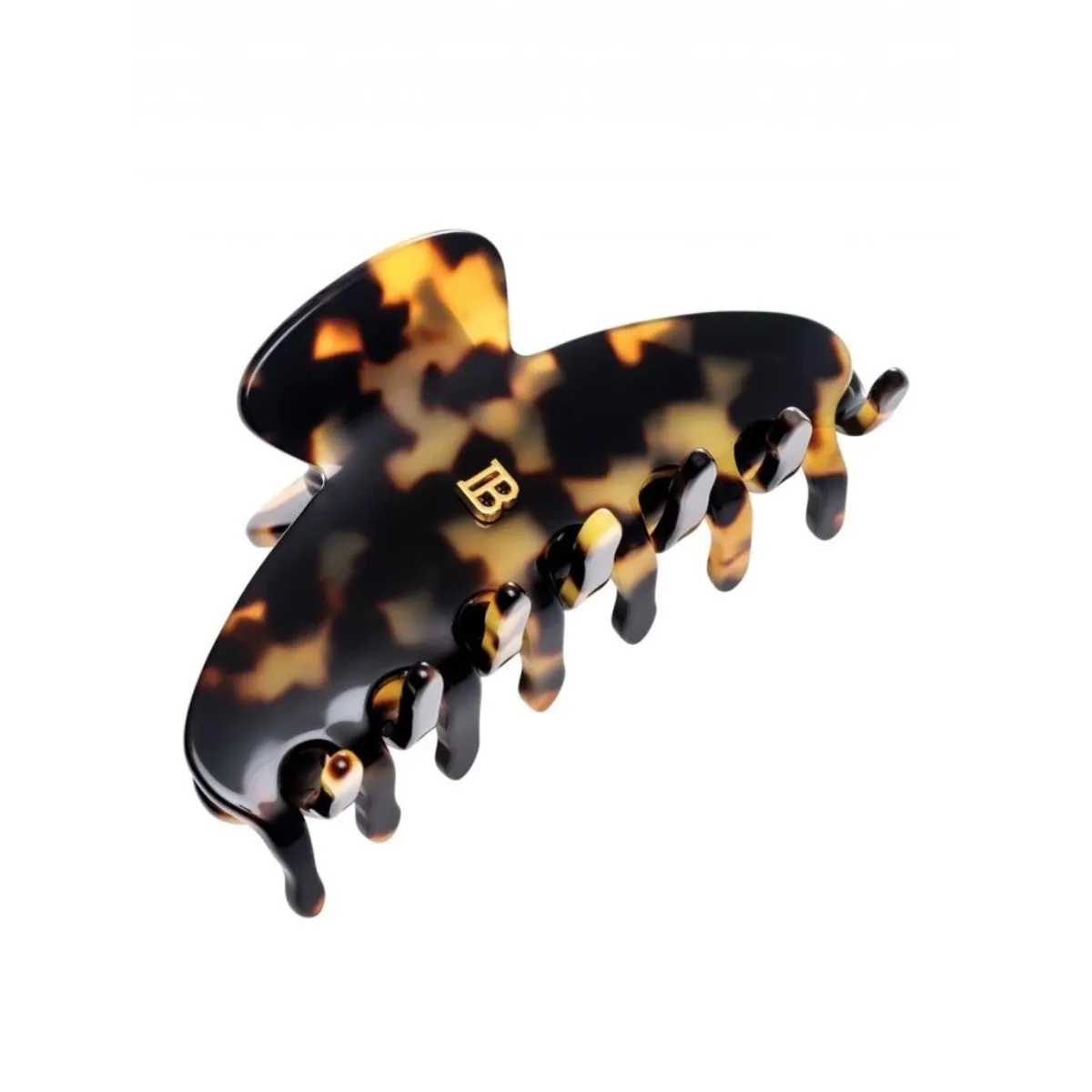 Vysoko kvalitný, ručne vyrobený vlasový štipec z odolného acetátu celulózy, zdobený typickým znakom "B" vytvoreným zo 14-karátového plátkového zlata. Veľmi pevný, avšak pružný materiál je hypoalergénny a šetrný voči vlasom aj pokožke hlavy.