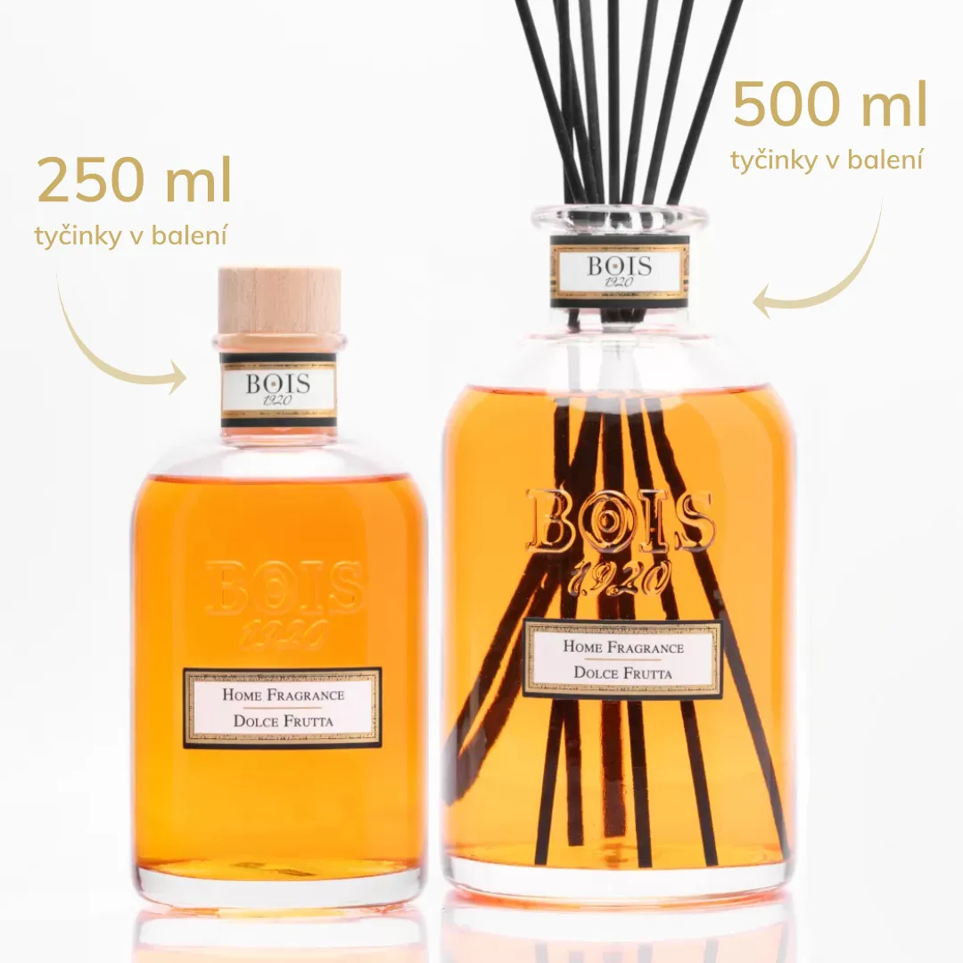 Aróma difuzér Dolce Frutta premení akýkoľvek interiér v lákavý raj. Miesto, kde sa jahody miešajú s krémovým karamelom a sviežim citrónom a vytvárajú sladkú a podmanivú atmosféru. Obsahuje 8 bambusových tyčiniek. Intenzitu vône môžete regulovať množstvom použitých tyčiniek a ich otáčaním. Doba vône sa môže u objemu 100 - 250 ml pohybovať od 2 do 6 mesiacov v závislosti na veľkosti priestoru, vetraní, teplote a regulácii intenzity vône.