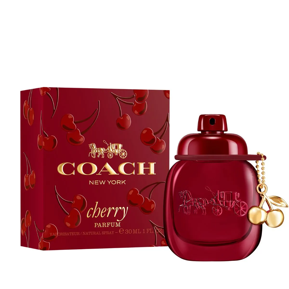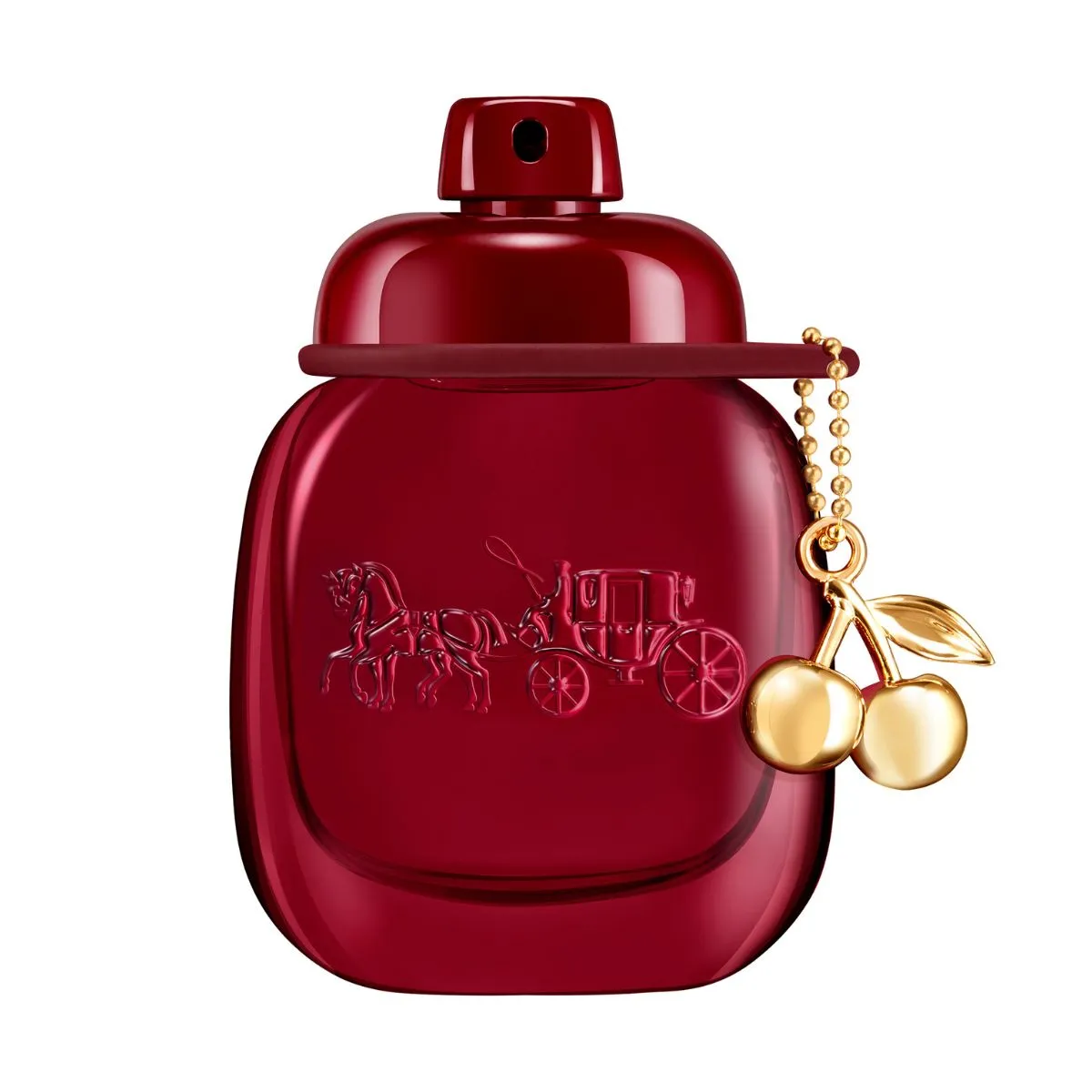 Flakón zdobí intenzívny, mierne transparentný červený lak. Ikonický prívesok Coach Fashion v tvare čerešne je spracovaný v zlatom prevedení a slúži ako šperk na flakóne.
