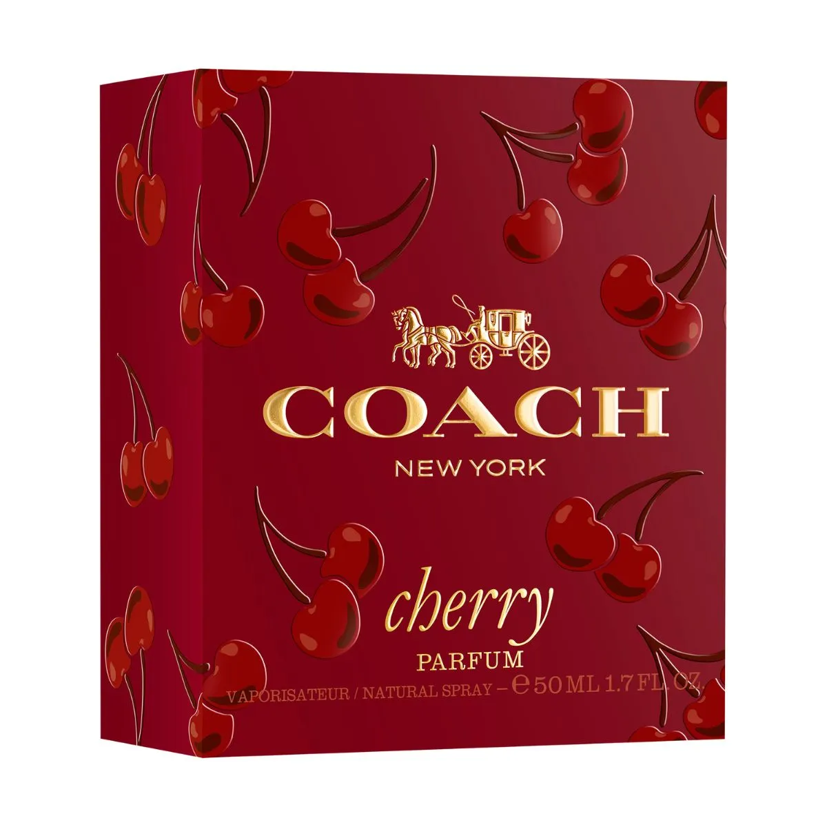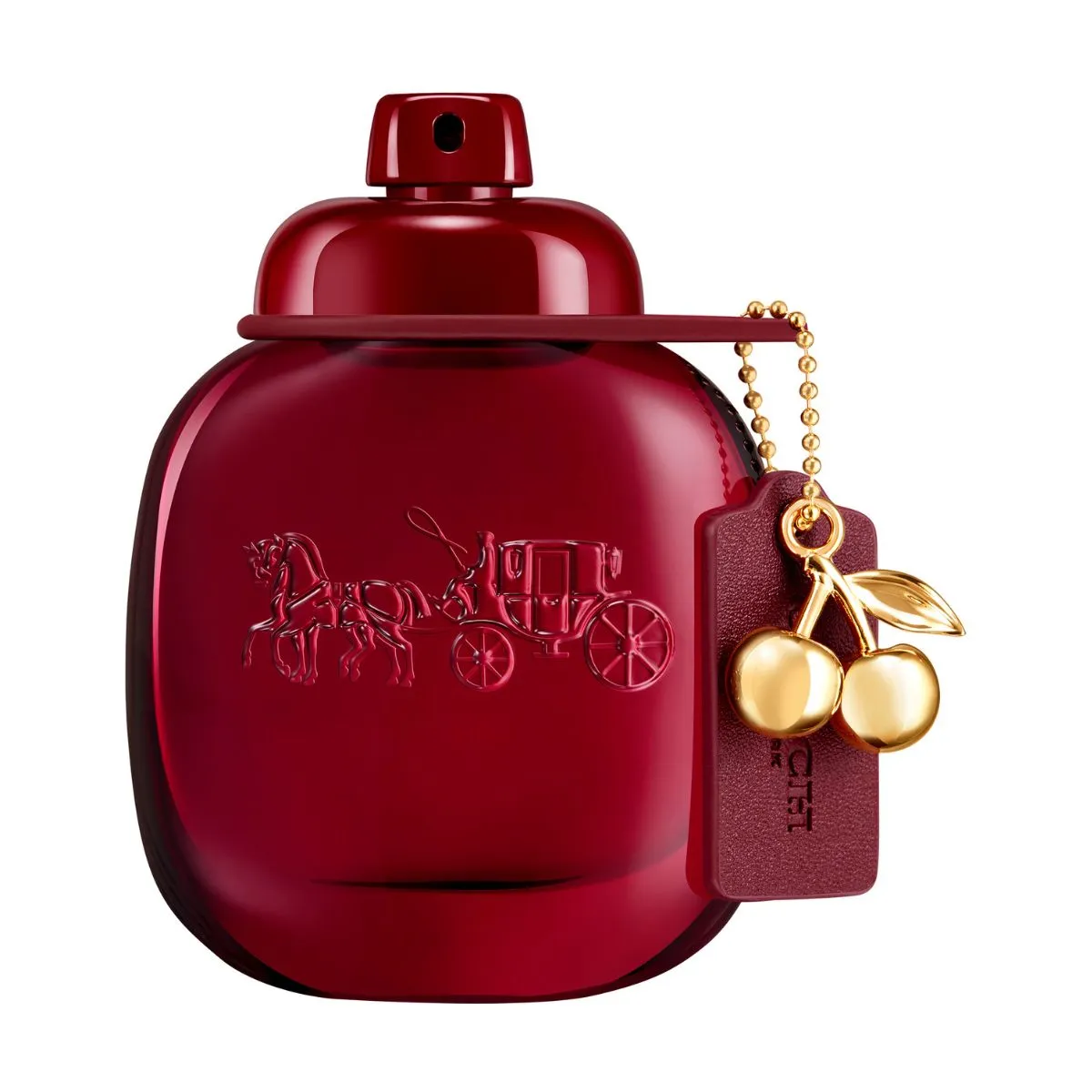 Flakón zdobí intenzívny, mierne transparentný červený lak. Ikonický prívesok Coach Fashion v tvare čerešne je spracovaný v zlatom prevedení a slúži ako šperk na flakóne.