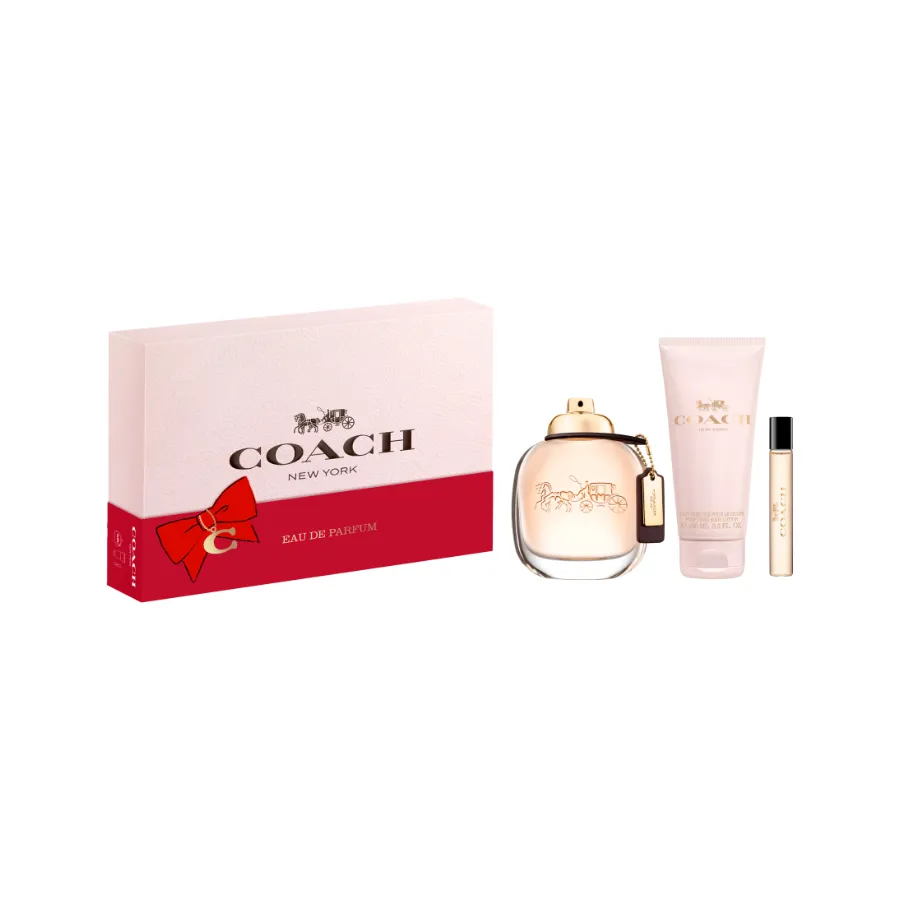 Darčekový set obsahuje:- Eau de Parfum 90 ml- Eau de Parfum 7,5 ml- Telové mlieko 100 mlPrvá parfumovaná voda pre ženy značky Coach sa inšpiruje vôňou moderného luxusu prameniaceho z cool mestskej atmosféry New Yorku. Táto kvetinovo-ovocná vôňa stelešňuje spontánnú energiu a elegantný štýl metropoly. Vytvorili ju renomované parfumérky Anne Flipo a Juliette Karagueuzoglou.Coach Eau de Parfum pre ženy je vôňa plná kontrastov. Otvára sa do ostro iskrivej maliny, ktorá dáva priechod krémovej tureckej ruži. Potom sa rozpustí v základe zmyselného zamatového pižma.Hlava: lístky maliníku, rúžové korenie, hruškaSrdce: turecká ruža, gardénia, cyklaménZáklad: semiš, pižmo, sekvojové drevo, kašmírFlakón vône je ženský a zmyselný. Je vyrobený z ťažkého skla a zdobí ho charakteristické logo značky Coach. Viečko má tvar zlatého otočného zámku, ktorý imituje typické zapínanie najznámejších kabeliek značky. Luxusný vzhľad podčiarkuje typická visačka z ebenovej kože s logom z pozláteného kovu.Tvárou parfumu sa stala americká herečka a fotomodelka Chloë Moretz, ktorá pózuje na pozadí new yorských striech zaliatých slnkom.Coach je tradičný výrobca luxusných kabeliek, koženého tovaru a módnych doplnkov. Jeho butiky nájdete po celom svete. Trvalým symbolom remeselnej zručnosti je logo s dvojzáprahom a kočárom. Parfumy prezentujú majstrovskú kvalitu tejto značky.