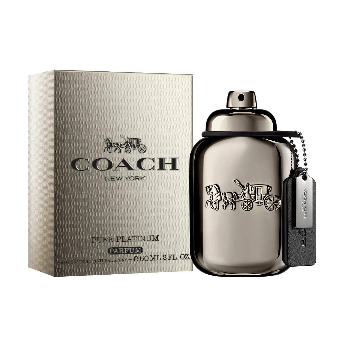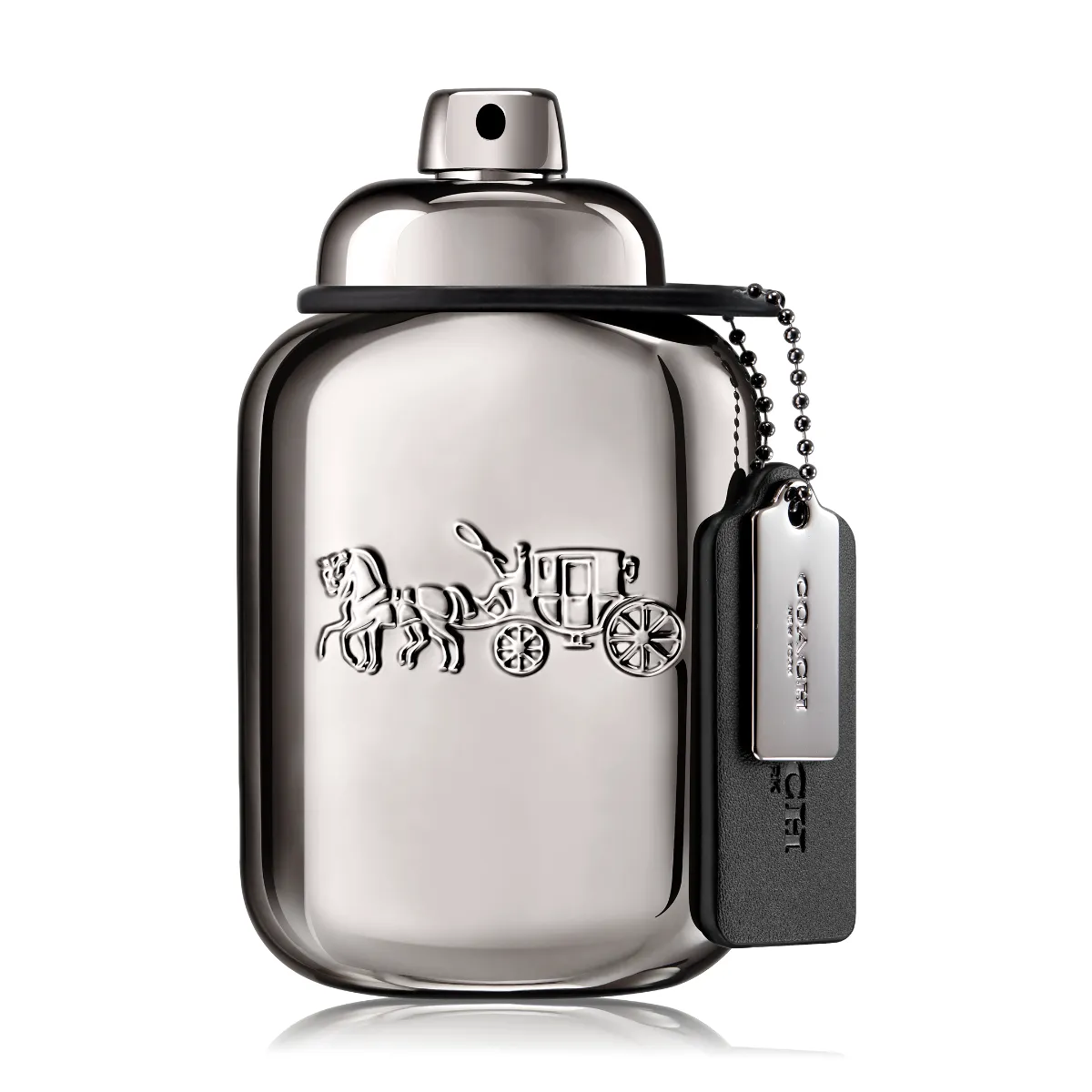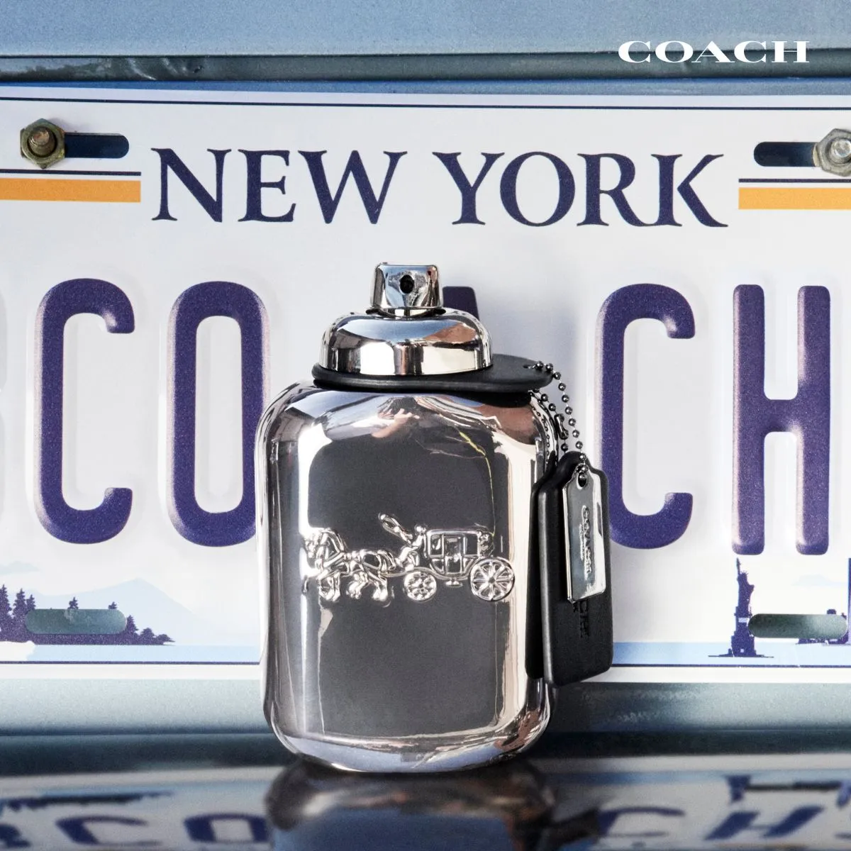 Flakón v metalickom gunmetal vyhotovení odráža modernú panorámu New Yorku. Zdobí ho ikonické logo Coach s kočom a koňmi, doplnené čiernym koženým príveskom a kovovým detailom. Celkové spracovanie spája tradíciu kožiarskeho remesla s moderným dizajnom.