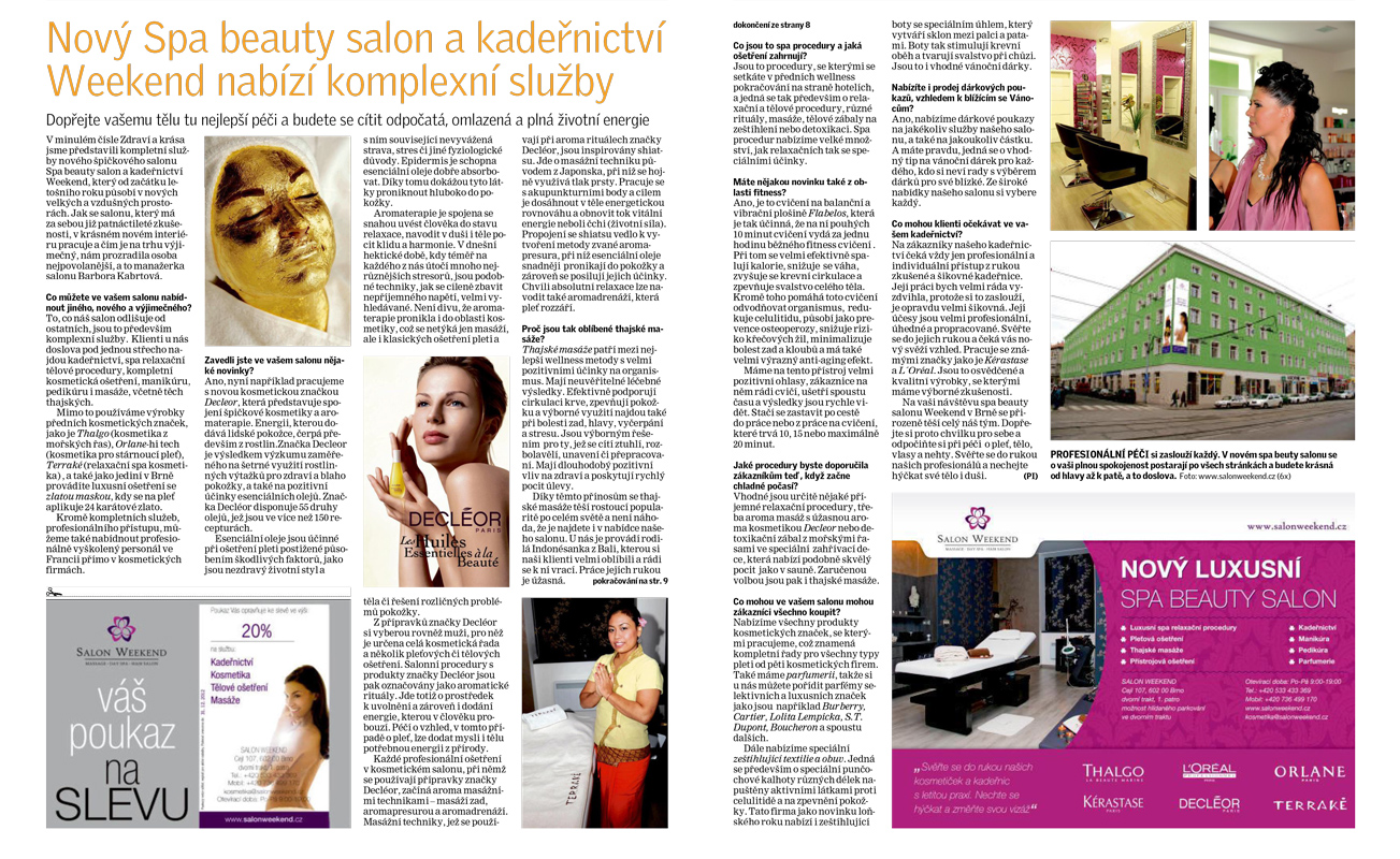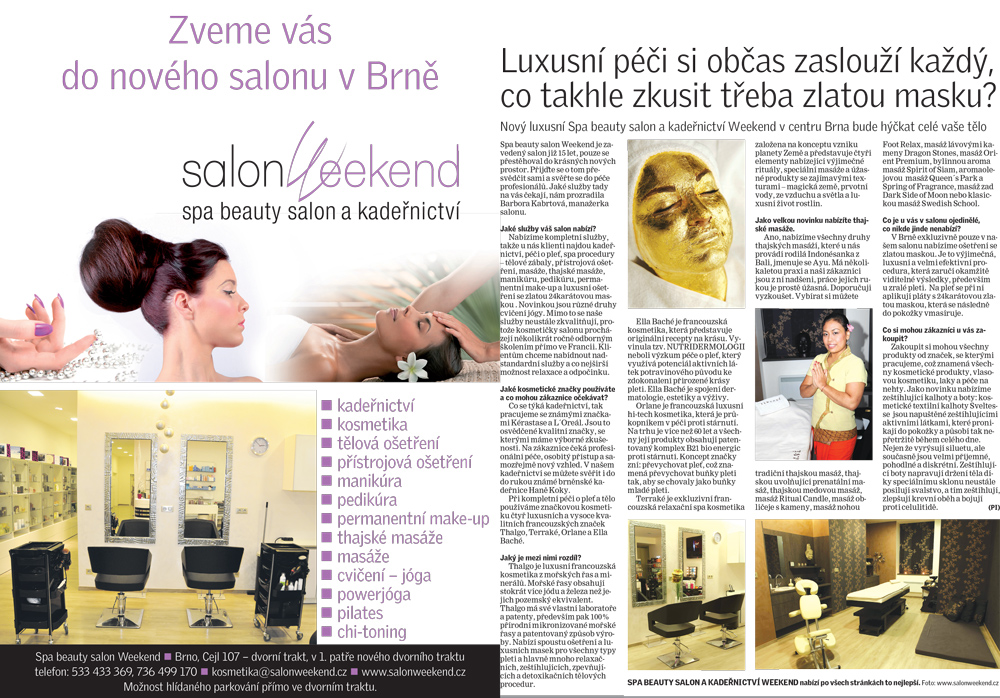 Mnoho let se o nás psalo jako o kosmetickém salonu Weekend. Nyní nabízíme ještě širší škálu služeb v příjemném prostředí pod názvem Sensualité Beauty. Harper´s Bazaar zařadil salon Weekend (nyní Sensualité Beauty) do tipů Kam pro radost. Časopis Style nás zařadil do tipů na víkend. Napsali o nás v Rovnosti. Napsali o nás v Mladé Frontě Dnes.