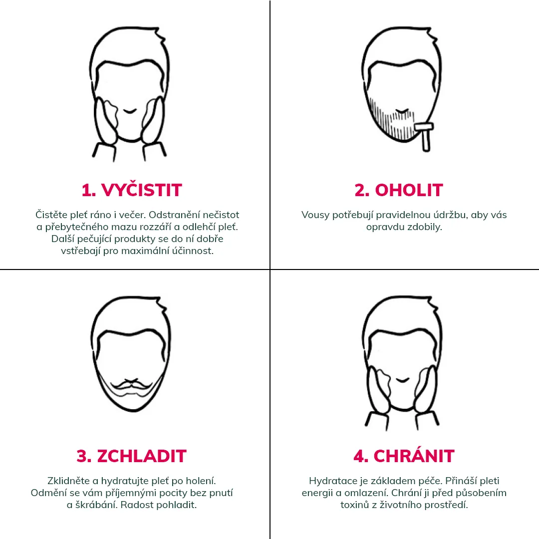 Použitie: pár kvapiek oleja rozotrite medzi dlaňami a potom votrite do fúzov od strán smerom k stredu, nakoniec fúzy a briadku. Upravte je hrebienkom.