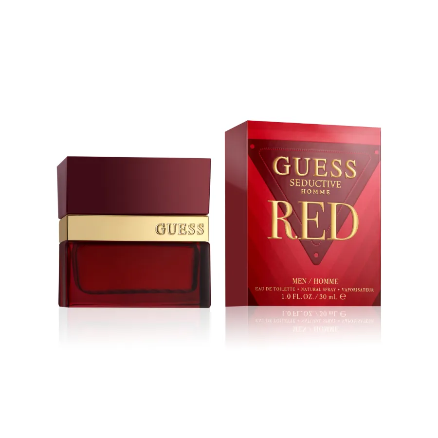 Flakón má mužný design vo výraznej a zvodnej červenej farbe s kontrastným zlatým limčekom.