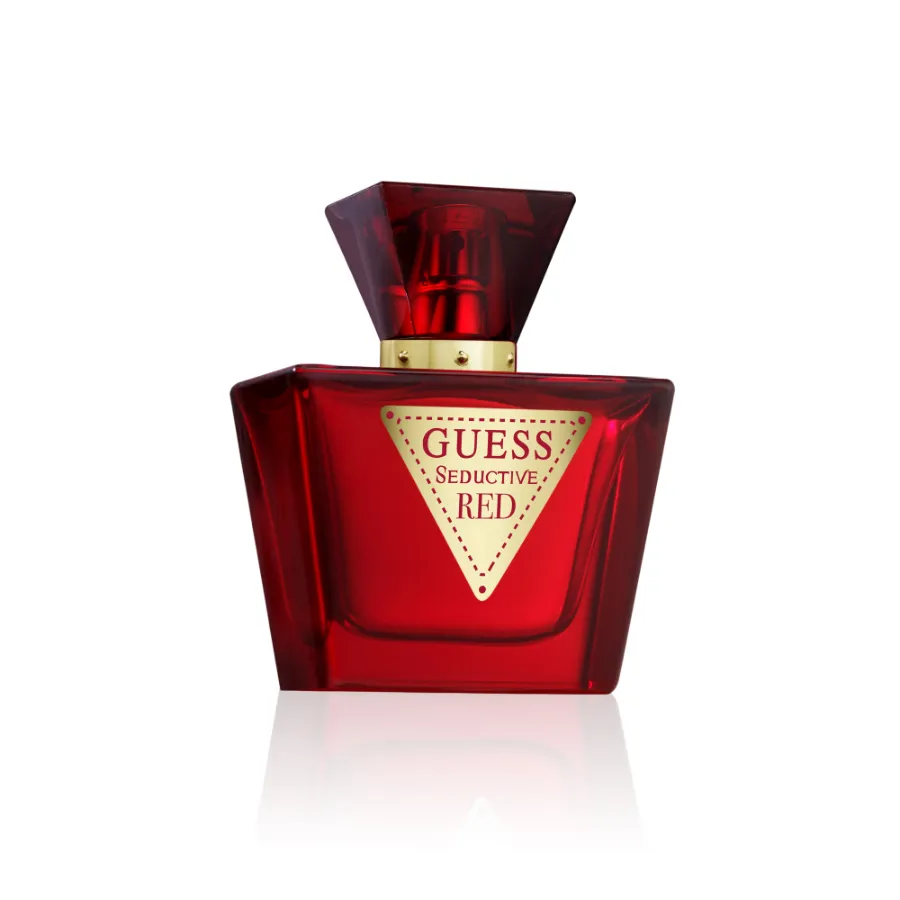Flakón v červenom zvodnom skle oživuje pokušenie vône Guess Seductive Red, ktoré doplňuje ikonické logo Guess v zlatej farbe.