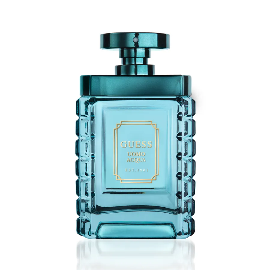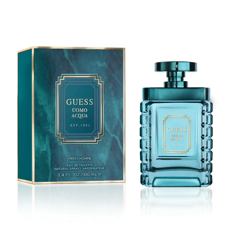 Design obalov nadväzuje na bohato prepracovaný design inšpirovaný talianskou architektúrou. Elegantná modrá, mramorovaná krabička obsahuje umelecky navrhnutý flakón z tyrkysového skla, pripomínajúci vody Stredozemného mora a logom Guess Uomo Acqua.