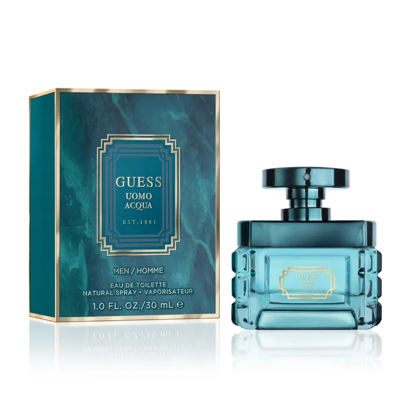 Design obalov nadväzuje na bohato prepracovaný design inšpirovaný talianskou architektúrou. Elegantná modrá, mramorovaná krabička obsahuje umelecky navrhnutý flakón z tyrkysového skla, pripomínajúci vody Stredozemného mora a logom Guess Uomo Acqua.