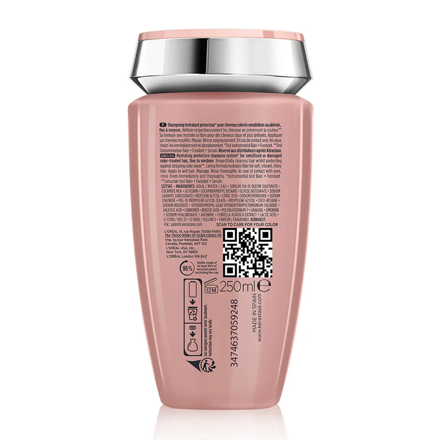 Vhodný pre jemné až stredne silné vlasy.Ružová krémovo-gélová textúra sa stará o vlasy a hydratuje ich do hĺbky. Redukuje poréznosť vlasov, chráni farbu a zabraňuje jej postupnému vymývaniu.Zloženie je obohatené o kyselinu mliečnou a výťažok z pupočníku ázijského. Táto zdokonalená receptúra preniká do vlasového jadra pre silnejšie a odolnejšie vlasy.Neobsahuje sulfáty, silikóny ani parabeny.Obaly šampónov sú vyrobené z 95% recyklovaných plastov.Použitie: Naneste do mokrých vlasov, ľahko vmasírujte. Napeňte a dôkladne opláchnite.Inštrumentálny test:- vlasy sú oslnivo lesklé a žiarivejšie o 74 %- aj po 6 týždňoch je intenzita farby zachovaná na 92 %