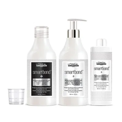 Ochranná a posilujicí vlasová kúra Smartbond značky L´Oréal pomáhá poškozeným, citlivým, mdlým, barveným, melírovaným a odbarvovaným vlasům. Kúra Smartbond umí posílit, zvýšit odolnost, zjemnit a přidat vlasům lesk. Jedná se o jedinečný systém, který chrání a posiluje vlasy během kadeřnických výkonů jako je barvení a odbarvování. Systém sestává ze tří komponentů. První dva se používají v salonech a třetí je k domácímu použití. Velmi snadno se používá a adaptuje do Vaší denní péče o vlasy.Cena se účtuje dle spotřebovaného materiálu po 100 Kč za 1 dávku.Profesionální značka L´Oréal je světovým lídrem v oblasti kosmetické péče. Nabízí jedinečné kadeřnické produkty na míru všem typům vlasů. Obsahují účinné aktivní látky na základě nejnovějších výzkumů a úzké spolupráce s profesionálními kadeřníky. Vydejte se s námi na cestu za hledáním vaší krásy a uvolněním těla i mysli. V salonech a spa Sensualité dostanete tu nejlepší individuální a cílenou kosmetickou péči.