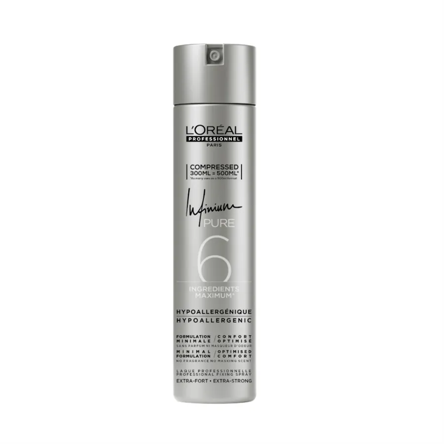 Hypoalergénny lak na vlasy Infinium Pure Strong od 'Oréal Professionnel vyniká svojím ultra ľahkým zložením a extra silnou fixáciou. Vďaka minimalistickej receptúre s iba 6 funkčnými zložkami poskytuje čistý, prirodzený výsledok bez zbytočného zaťažovania. Nezanecháva žiadne viditeľné stopy, dodáva vlasom jemný lesk a vonia po prírodných ingredienciách. Ideálny na každodenné použitie aj pre citlivejšie typy pokožky.