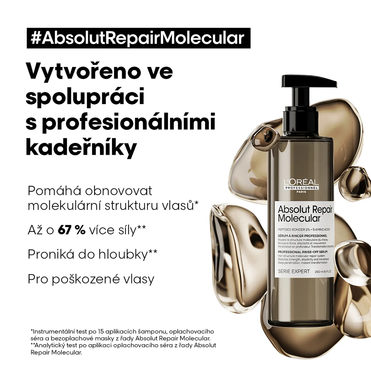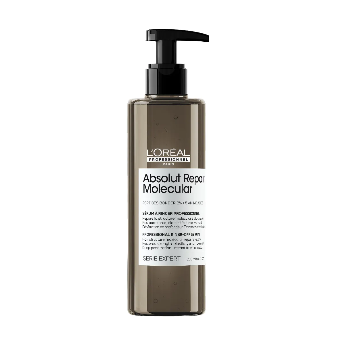 Exkluzívne koncentrované bezoplachové sérum Absolut Repair Molecular je obohatené o 5 aminokyselín a zložku Peptides bonder. Pomáha obnoviť molekulárnu štruktúru vlasového vlákna. Táto štruktúra je tvorená peptidmi, ale väčšina z nich je príliš veľká na to, aby prenikla do vlákna z bežných produktov.