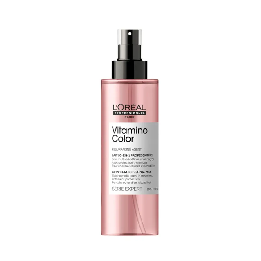 L'Oréal Professionnel Serie Expert Vitamino Color 10 in 1 Spray je bezoplachová starostlivosť vytvorená pre potreby farbených a melírovaných vlasov. Poskytuje im lesk, jemnosť a zároveň chráni farbu vďaka uzamknutiu pigmentov vo vnútri vlasového vlákna. Sprej taktiež hydratuje, obmedzuje lámanie a znižuje krepovatenie, čím zabezpečuje zdravý vzhľad a jednoduchú úpravu vlasov.