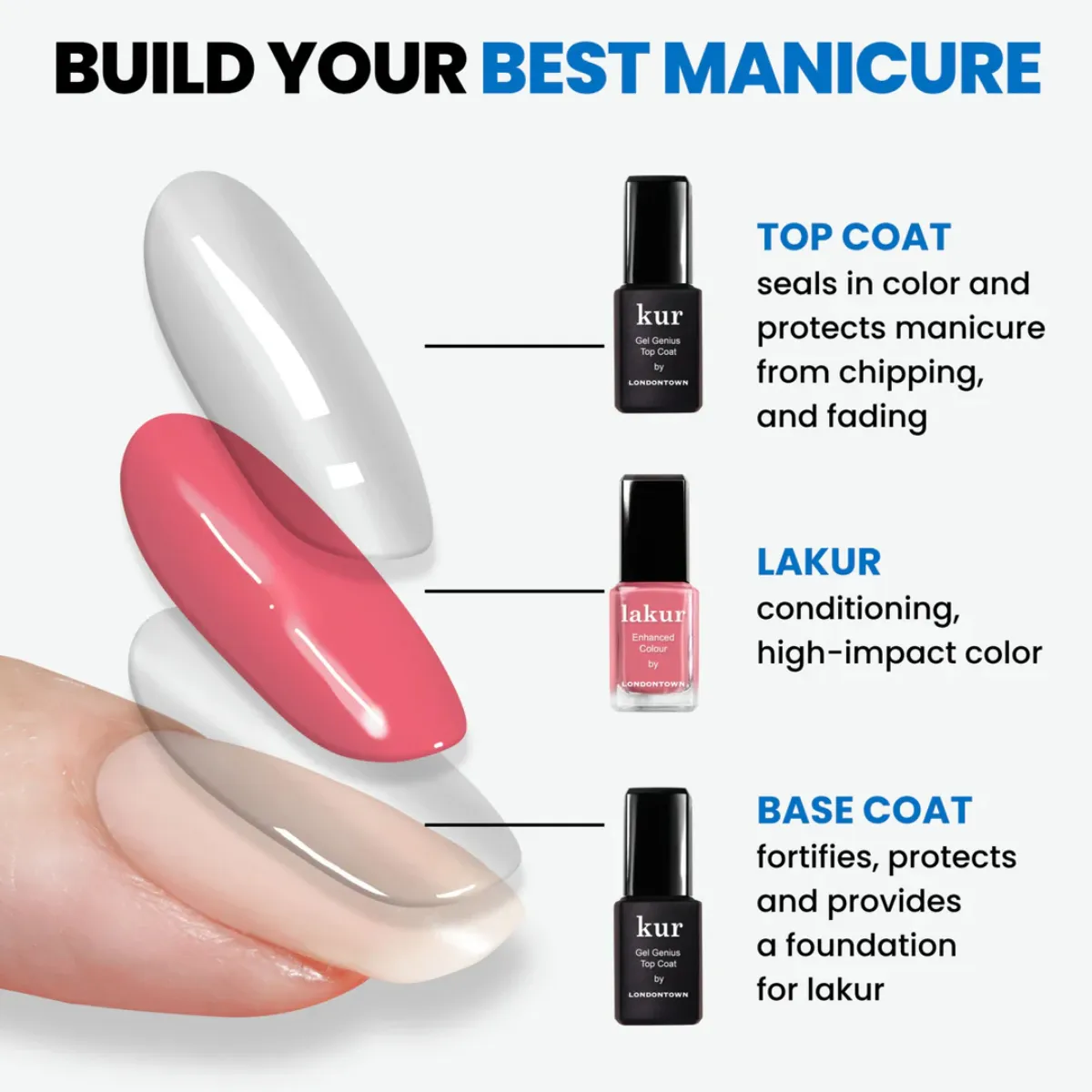 Naneste jednu tenkú vrstvu. Nečakajte a aplikujte 1–2 tenké vrstvy farebného laku lakur. Vždy počkajte, kým farba úplne zaschne. Manikúru zafixujte pomocou top coatu z rady kur. Ak ho chcete používať ako kúru na posilnenie nechtov, aplikujte 1x denne na nenalakované nechty.