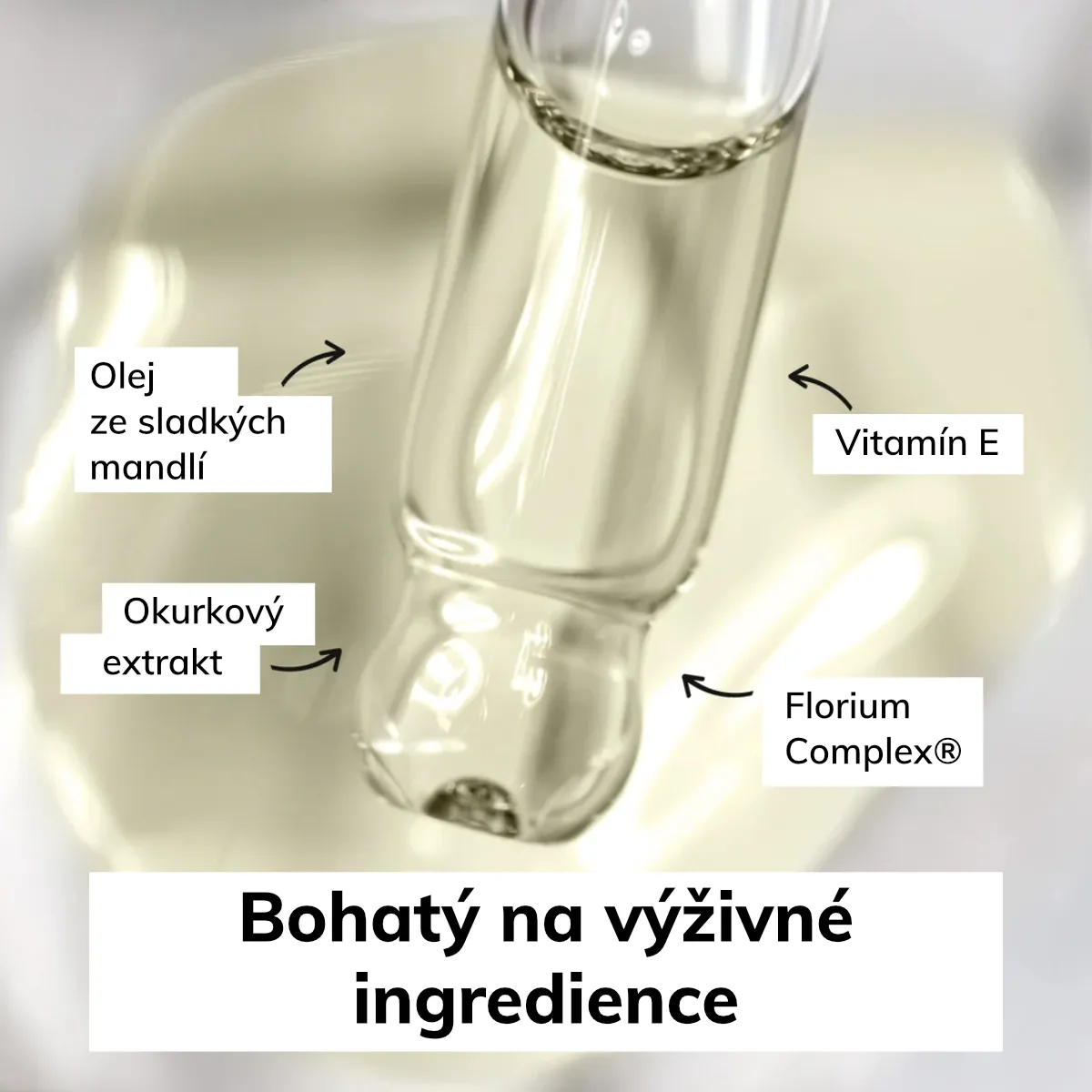 - Výživný Florium Complex® - patentovaná zmes olejov z repky a pupalky, extrakt z uhorky, cesnaku a harmančeka, vitamín E