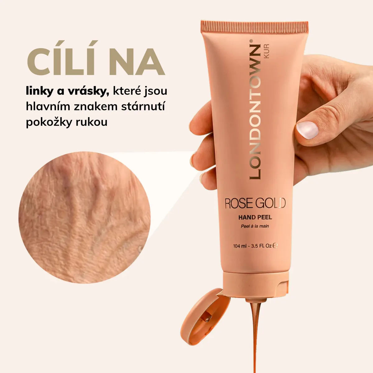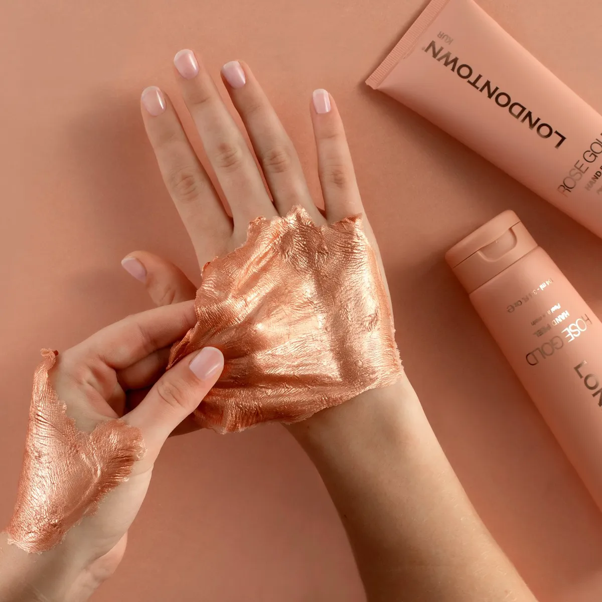 Luxusná zlupovacia maska sa nanáša ako ružové tekuté zlato a zanecháva pokožku rúk jemnú, zregenerovanú a rozjasnenú.