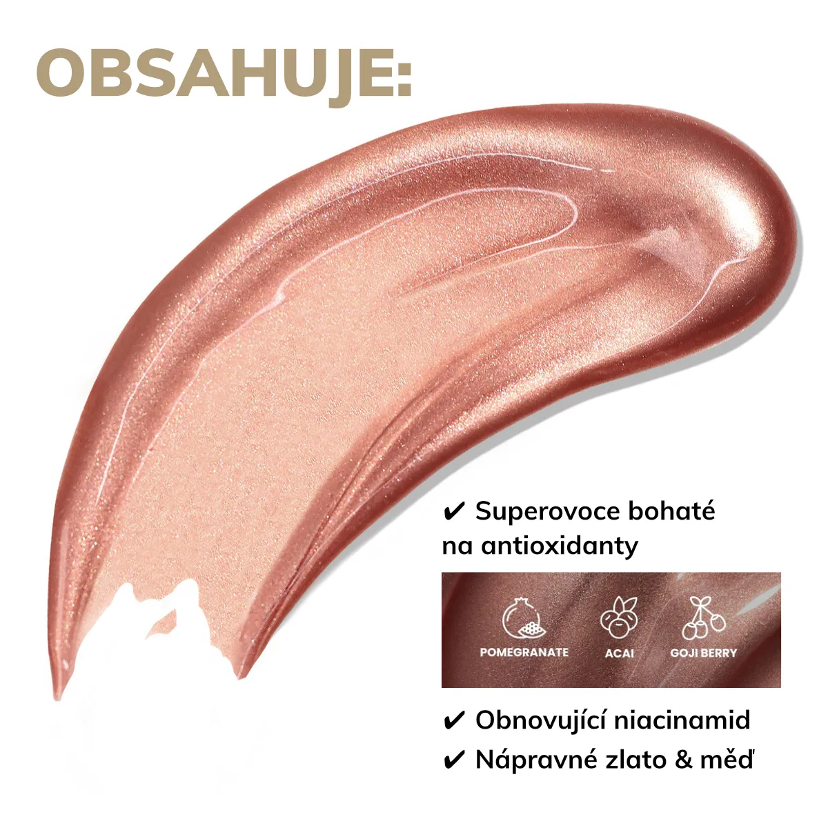 - Výťažky bohaté na antioxidanty a podporujúce mladosť pokožky - z acai, camu camu, žeruchy záhradnej, goji, mangostanu, noni a granátového jablka