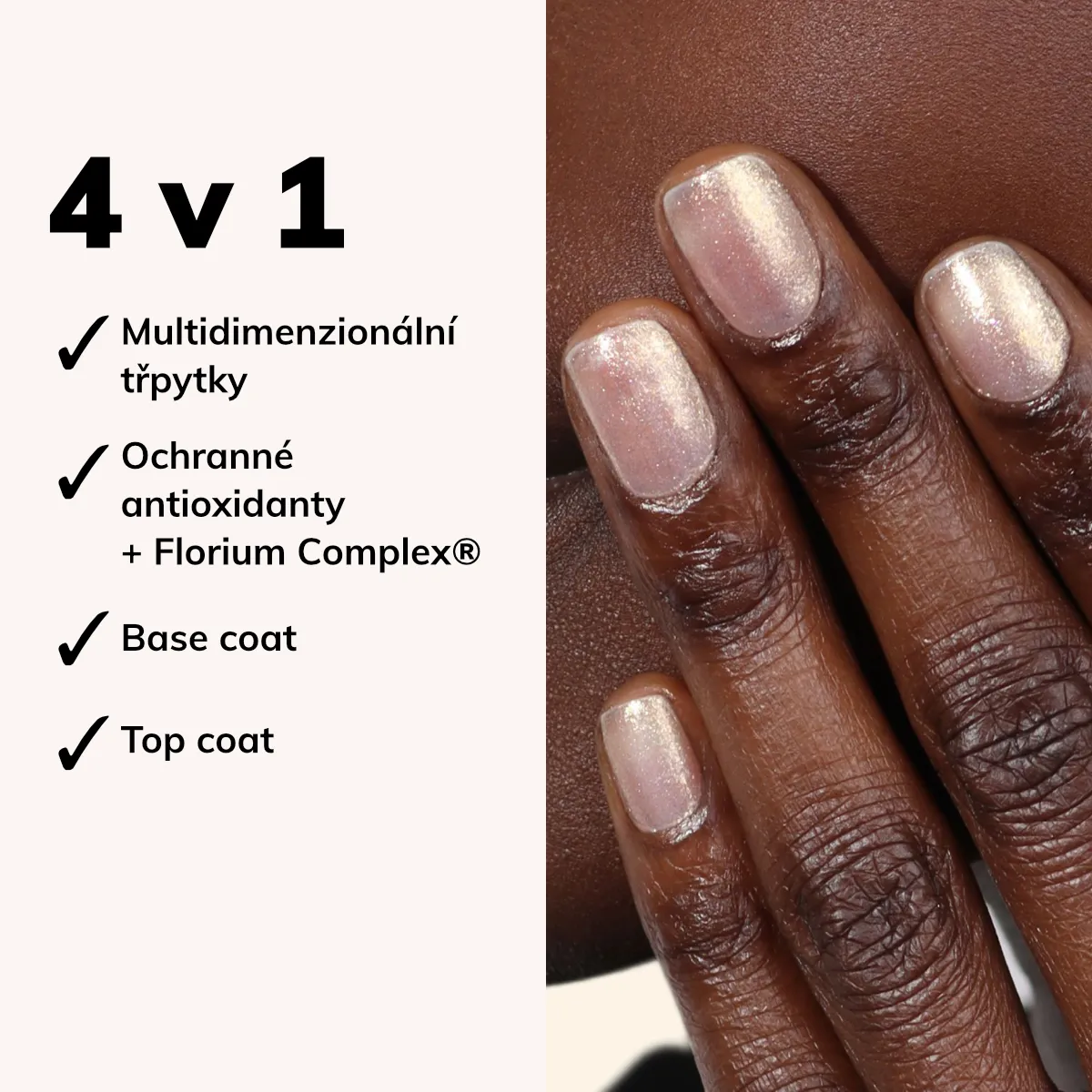 - Vzorec 4 v 1 spája všetky výhody podkladového laku, vrchného laku, trblietavého laku a starostlivosti o nechty pre dokonalú manikúru v jednom kroku.