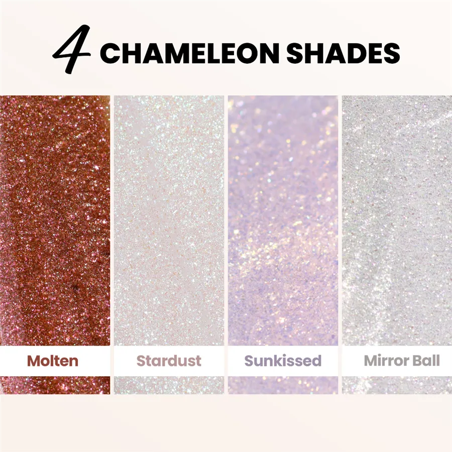 Objavte trblietavý lak na nechty pre rýchlu manikúru v jednom kroku. Kombinuje oslnivý lesk s obsahom antioxidantov a zároveň pôsobí ako ochranný štít pre vaše nechty. Inšpirovaný kúzlom rozjasňovačov na pleť. Tieto chameleónske odtiene zachytia každý lúč svetla a vytvoria očarujúci trblietavý efekt vďaka pokročilým viacvrstvovým pigmentom, ktoré menia odtieň v každom uhle. Ošetrujúce zložky chránia vaše nechty pred nepriaznivými vplyvmi.