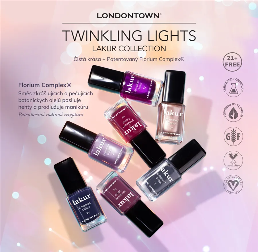 Luxusné laky na nechty Londontown lakur vyživujú a skrášľujú zároveň, pritom sú vysoko odolné, rýchlo schnú a majú takmer gélový lesk. Obsahujú Florium Complex®, starostlivo strážený rodinný recept – zmes botanických olejov a extraktov na posilnenie, hydratáciu a regeneráciu nechtov a pokožky. Laky na nechty lakur predstavujú prelomovú kombináciu intenzívnej farby a jedinečnej starostlivosti kur® – výsledok premysleného prístupu, ktorý spája to najlepšie z čistých ingrediencií a účinnej, profesionálnej technológie. Vyberte si clean beauty.