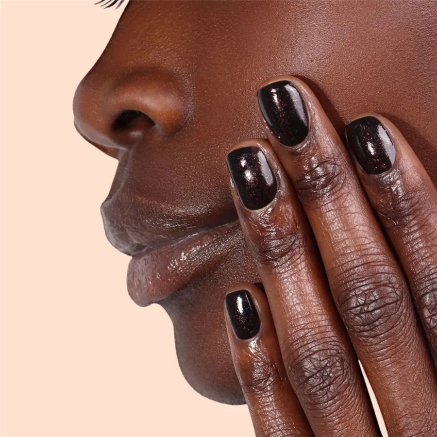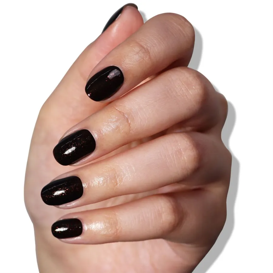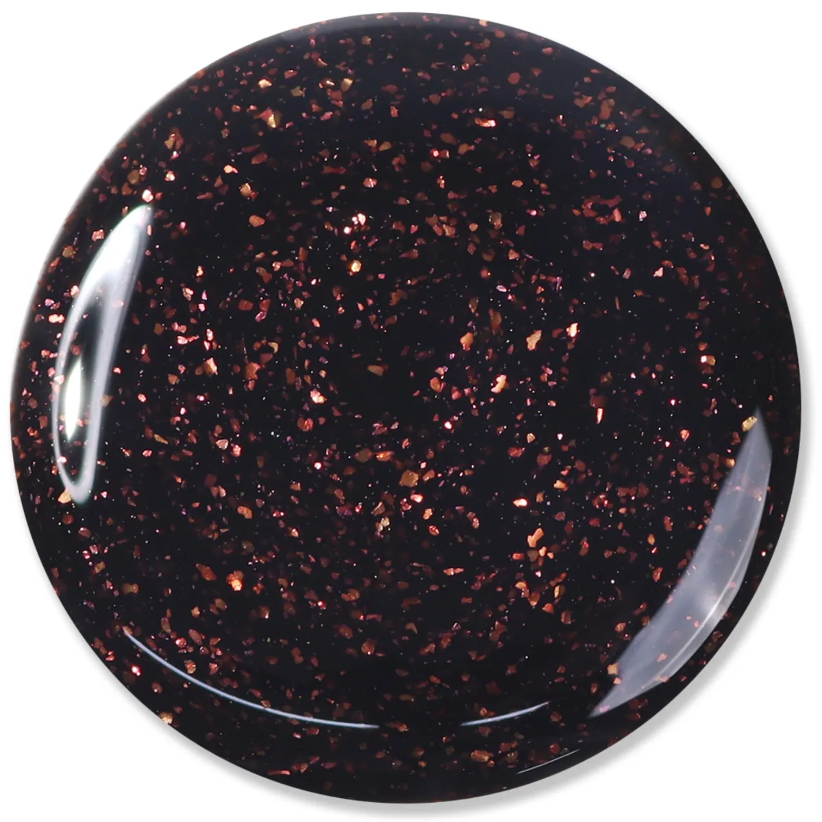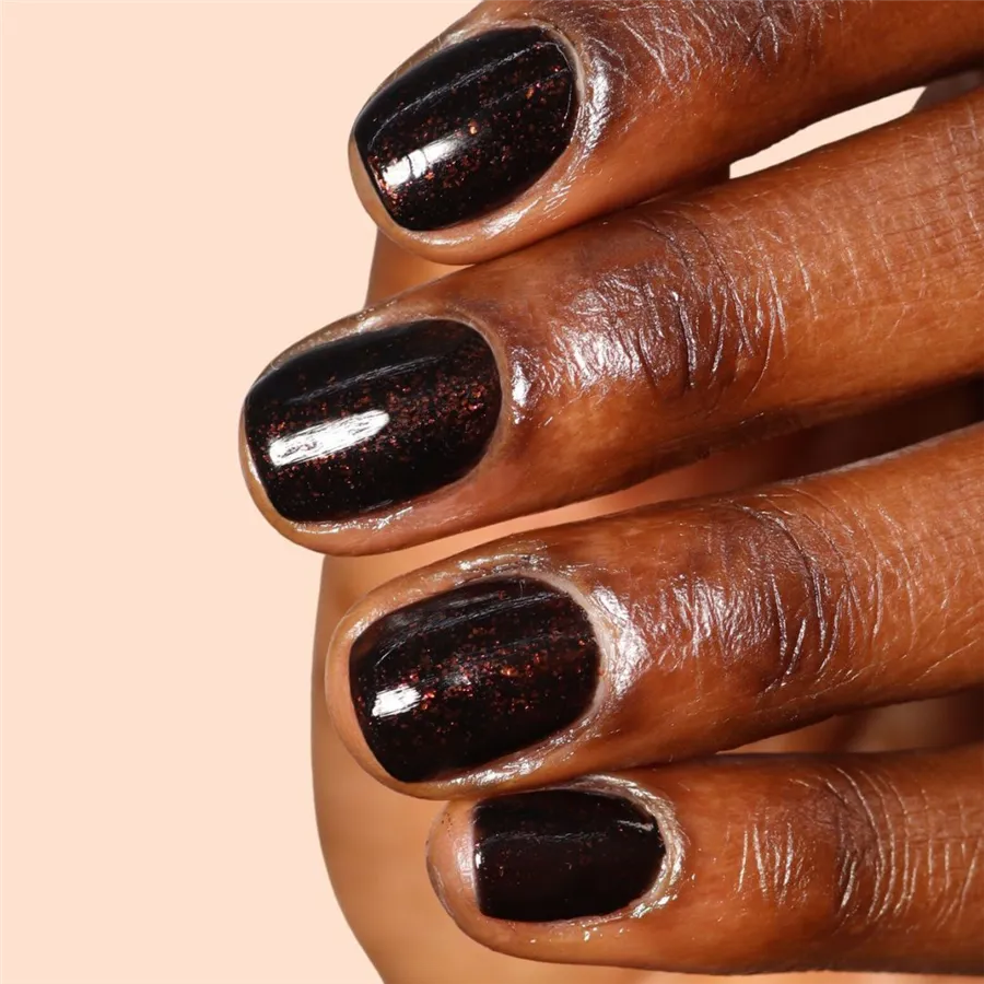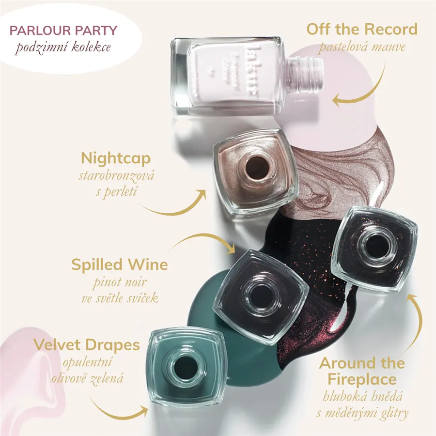 Lak na nechty v tmavohnedom odtieni s medenými trblietkami z kolekcie Parlour Party je inšpirovaný živou atmosférou vintage večierkov. Clean beauty.
