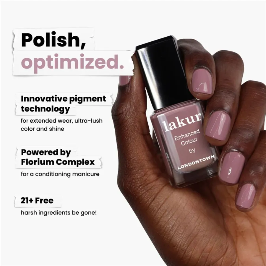 Luxusné laky na nechty Londontown lakur vyživujú a skrášľujú zároveň, pritom sú vysoko odolné, rýchlo schnú a majú takmer gélový lesk. Obsahujú Florium Complex®, starostlivo strážený rodinný recept – zmes botanických olejov a extraktov na posilnenie, hydratáciu a regeneráciu nechtov a pokožky. Laky na nechty lakur predstavujú prelomovú kombináciu intenzívnej farby a jedinečnej starostlivosti kur® – výsledok premysleného prístupu, ktorý spája to najlepšie z čistých ingrediencií a účinnej, profesionálnej technológie. Vyberte si clean beauty.