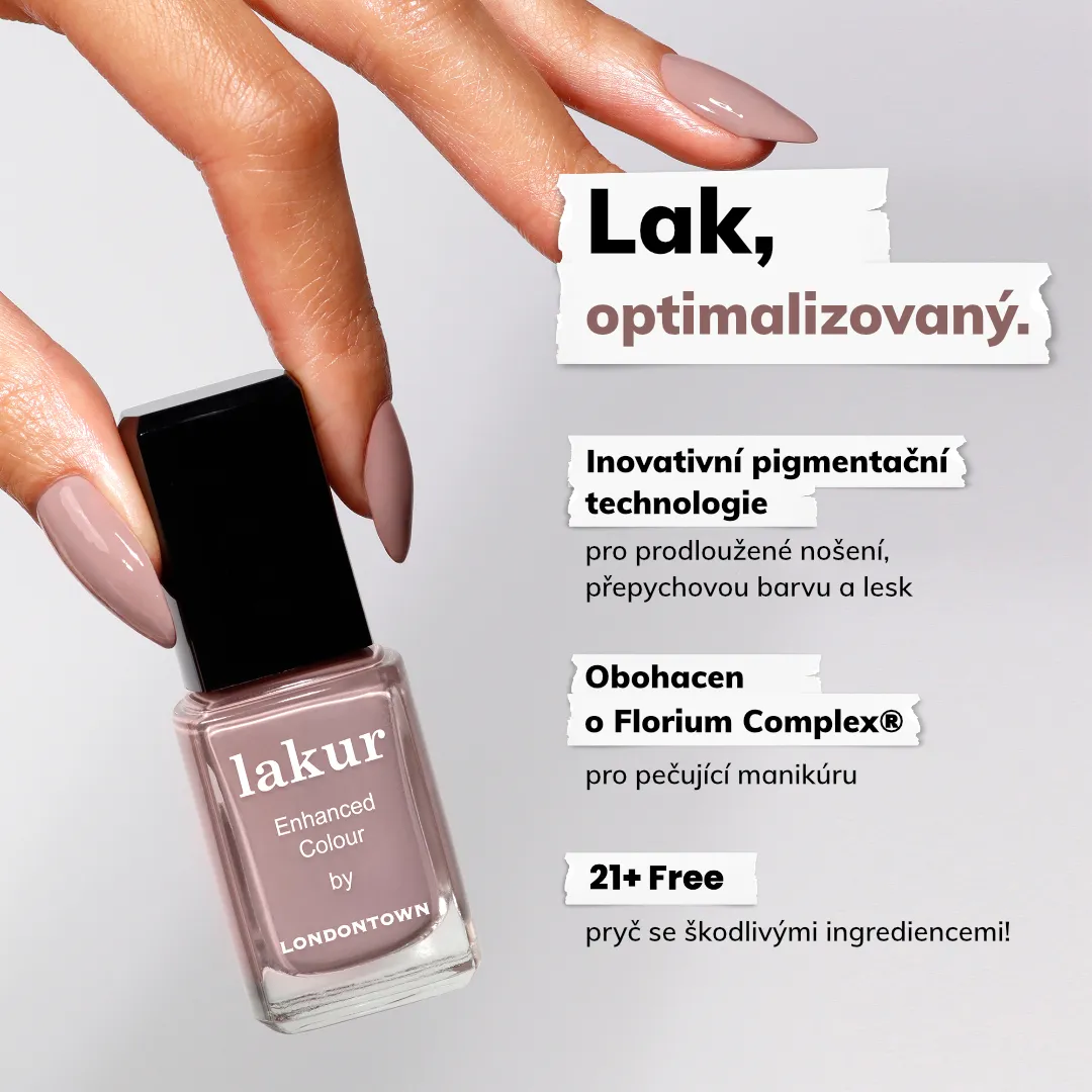Luxusné laky na nechty Londontown lakur vyživujú a skrášľujú zároveň, pritom sú vysoko odolné, rýchlo schnú a majú takmer gélový lesk. Obsahujú Florium Complex®, starostlivo strážený rodinný recept – zmes botanických olejov a extraktov na posilnenie, hydratáciu a regeneráciu nechtov a pokožky. Laky na nechty lakur predstavujú prelomovú kombináciu intenzívnej farby a jedinečnej starostlivosti kur® – výsledok premysleného prístupu, ktorý spája to najlepšie z čistých ingrediencií a účinnej, profesionálnej technológie. Vyberte si clean beauty.