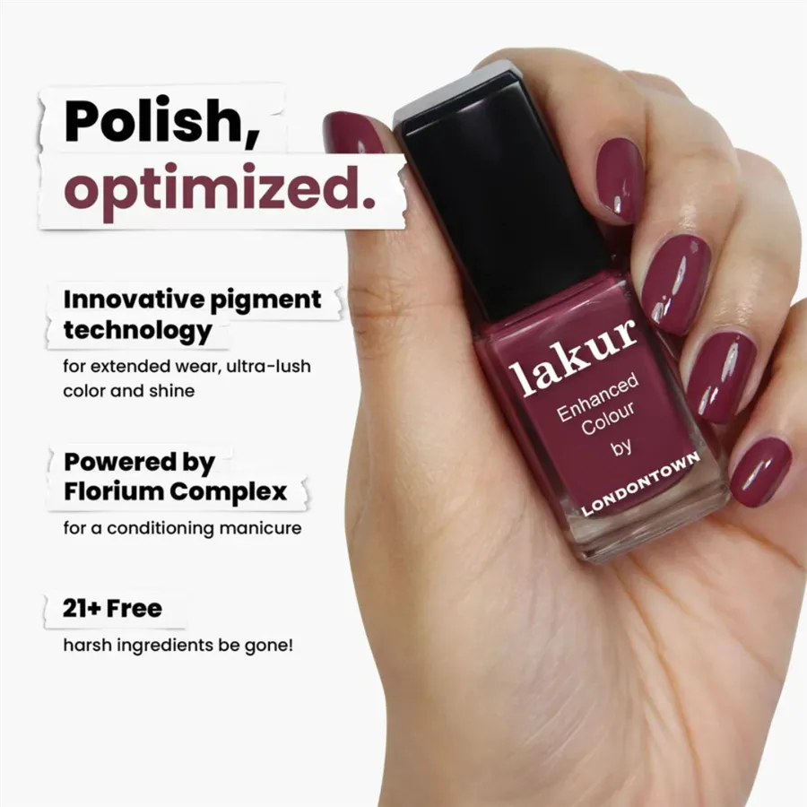 Luxusné laky na nechty Londontown lakur vyživujú a skrášľujú zároveň, pritom sú vysoko odolné, rýchlo schnú a majú takmer gélový lesk. Obsahujú Florium Complex®, starostlivo strážený rodinný recept – zmes botanických olejov a extraktov na posilnenie, hydratáciu a regeneráciu nechtov a pokožky. Laky na nechty lakur predstavujú prelomovú kombináciu intenzívnej farby a jedinečnej starostlivosti kur® – výsledok premysleného prístupu, ktorý spája to najlepšie z čistých ingrediencií a účinnej, profesionálnej technológie. Vyberte si clean beauty.