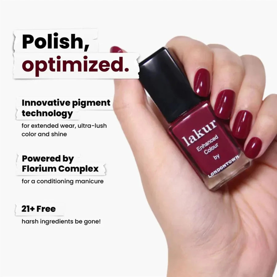Luxusné laky na nechty Londontown lakur vyživujú a skrášľujú zároveň, pritom sú vysoko odolné, rýchlo schnú a majú takmer gélový lesk. Obsahujú Florium Complex®, starostlivo strážený rodinný recept – zmes botanických olejov a extraktov na posilnenie, hydratáciu a regeneráciu nechtov a pokožky. Laky na nechty lakur predstavujú prelomovú kombináciu intenzívnej farby a jedinečnej starostlivosti kur® – výsledok premysleného prístupu, ktorý spája to najlepšie z čistých ingrediencií a účinnej, profesionálnej technológie. Vyberte si clean beauty.