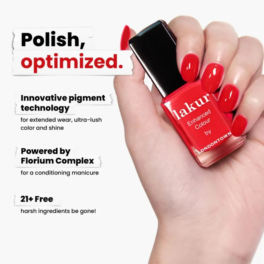 Luxusné laky na nechty Londontown lakur vyživujú a skrášľujú zároveň, pritom sú vysoko odolné, rýchlo schnú a majú takmer gélový lesk. Obsahujú Florium Complex®, starostlivo strážený rodinný recept – zmes botanických olejov a extraktov na posilnenie, hydratáciu a regeneráciu nechtov a pokožky. Laky na nechty lakur predstavujú prelomovú kombináciu intenzívnej farby a jedinečnej starostlivosti kur® – výsledok premysleného prístupu, ktorý spája to najlepšie z čistých ingrediencií a účinnej, profesionálnej technológie. Vyberte si clean beauty.