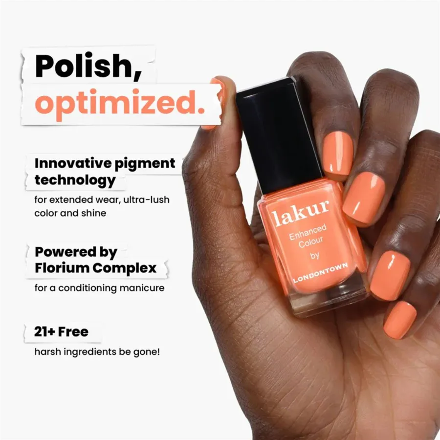 Luxusné laky na nechty Londontown lakur vyživujú a skrášľujú zároveň, pritom sú vysoko odolné, rýchlo schnú a majú takmer gélový lesk. Obsahujú Florium Complex®, starostlivo strážený rodinný recept – zmes botanických olejov a extraktov na posilnenie, hydratáciu a regeneráciu nechtov a pokožky. Laky na nechty lakur predstavujú prelomovú kombináciu intenzívnej farby a jedinečnej starostlivosti kur® – výsledok premysleného prístupu, ktorý spája to najlepšie z čistých ingrediencií a účinnej, profesionálnej technológie. Vyberte si clean beauty.