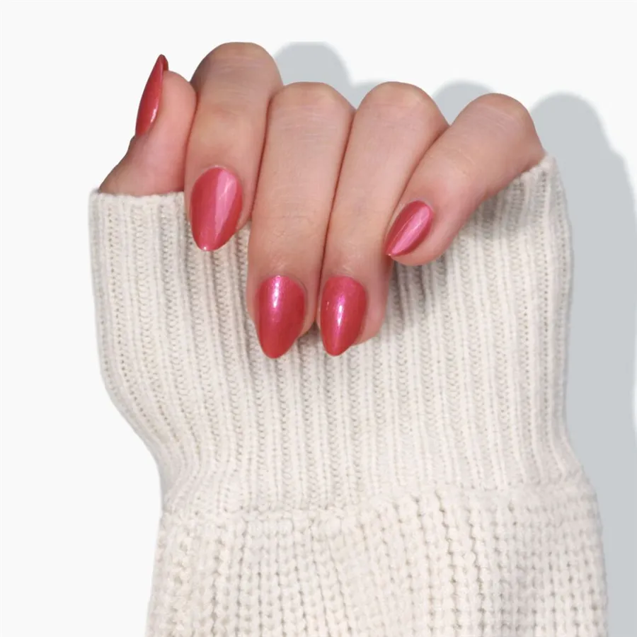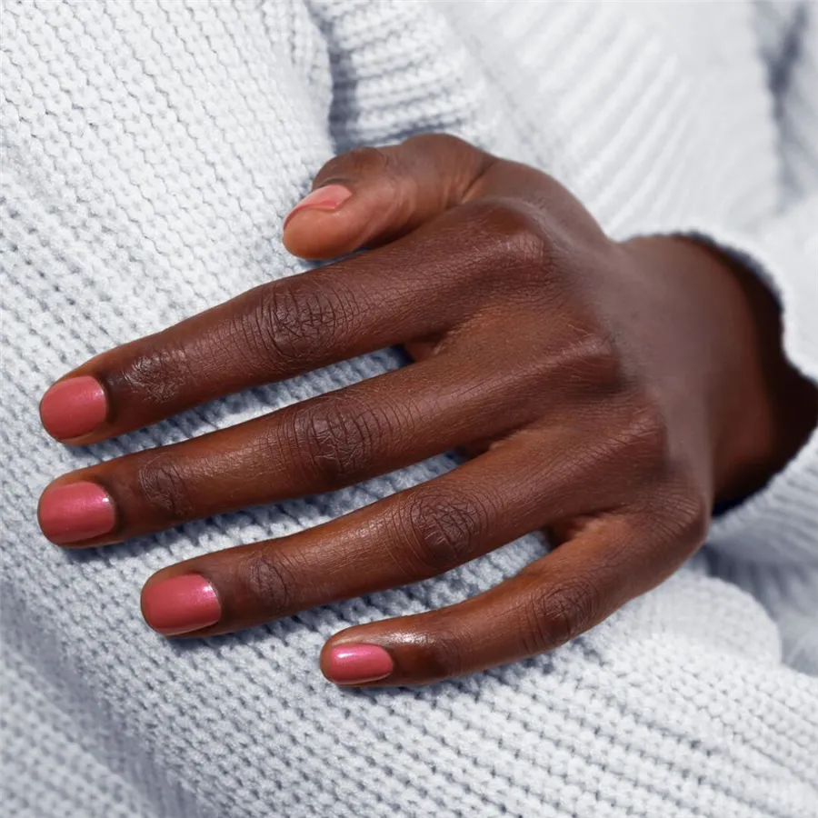 Chrómový lak na nechty v ružovej farbe ruže vás zahreje aj v tých najväčších mrazoch. Zo svahu priamo do strediska. Vyživujúci a clean beauty.
