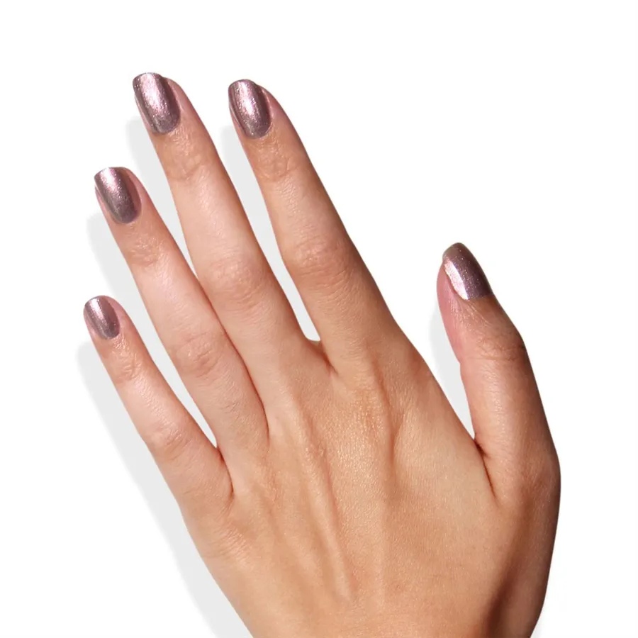 Odvážna ružovozlatá farba je dovedená k dokonalosti. Pri tanci hádže strieborné odlesky. Navyše vyživuje nechty, je vegánsky a 21+FREE.