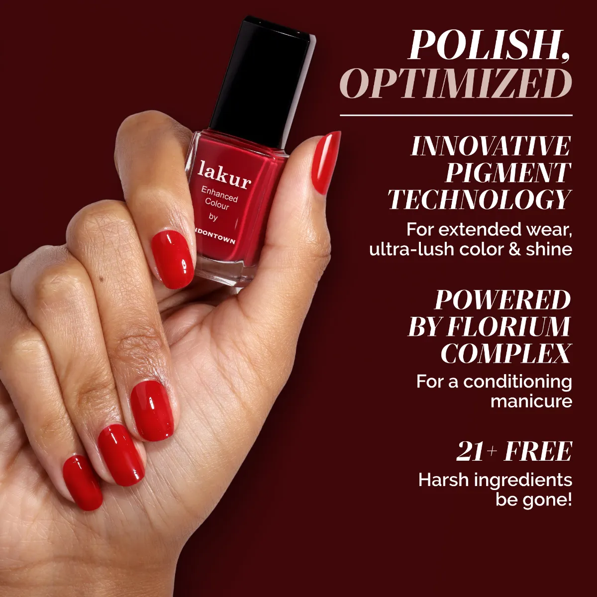 Luxusné laky na nechty Londontown lakur vyživujú a skrášľujú zároveň, pritom sú vysoko odolné, rýchlo schnú a majú takmer gélový lesk. Obsahujú Florium Complex®, starostlivo strážený rodinný recept – zmes botanických olejov a extraktov na posilnenie, hydratáciu a regeneráciu nechtov a pokožky. Laky na nechty lakur predstavujú prelomovú kombináciu intenzívnej farby a jedinečnej starostlivosti kur® – výsledok premysleného prístupu, ktorý spája to najlepšie z čistých ingrediencií a účinnej, profesionálnej technológie. Vyberte si clean beauty.