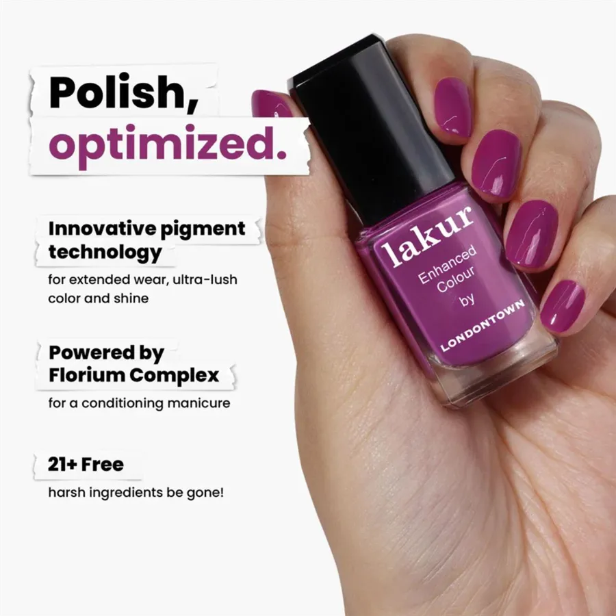 Luxusné laky na nechty Londontown lakur vyživujú a skrášľujú zároveň, pritom sú vysoko odolné, rýchlo schnú a majú takmer gélový lesk. Obsahujú Florium Complex®, starostlivo strážený rodinný recept – zmes botanických olejov a extraktov na posilnenie, hydratáciu a regeneráciu nechtov a pokožky. Laky na nechty lakur predstavujú prelomovú kombináciu intenzívnej farby a jedinečnej starostlivosti kur® – výsledok premysleného prístupu, ktorý spája to najlepšie z čistých ingrediencií a účinnej, profesionálnej technológie. Vyberte si clean beauty.