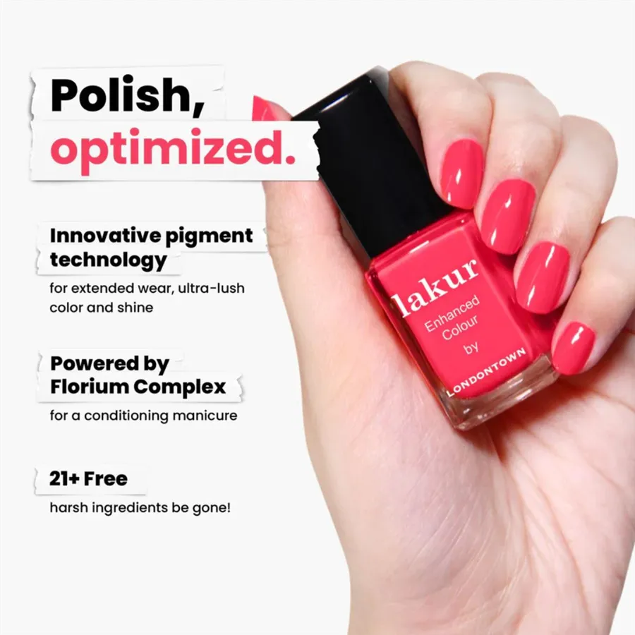 Luxusné laky na nechty Londontown lakur vyživujú a skrášľujú zároveň, pritom sú vysoko odolné, rýchlo schnú a majú takmer gélový lesk. Obsahujú Florium Complex®, starostlivo strážený rodinný recept – zmes botanických olejov a extraktov na posilnenie, hydratáciu a regeneráciu nechtov a pokožky. Laky na nechty lakur predstavujú prelomovú kombináciu intenzívnej farby a jedinečnej starostlivosti kur® – výsledok premysleného prístupu, ktorý spája to najlepšie z čistých ingrediencií a účinnej, profesionálnej technológie. Vyberte si clean beauty.