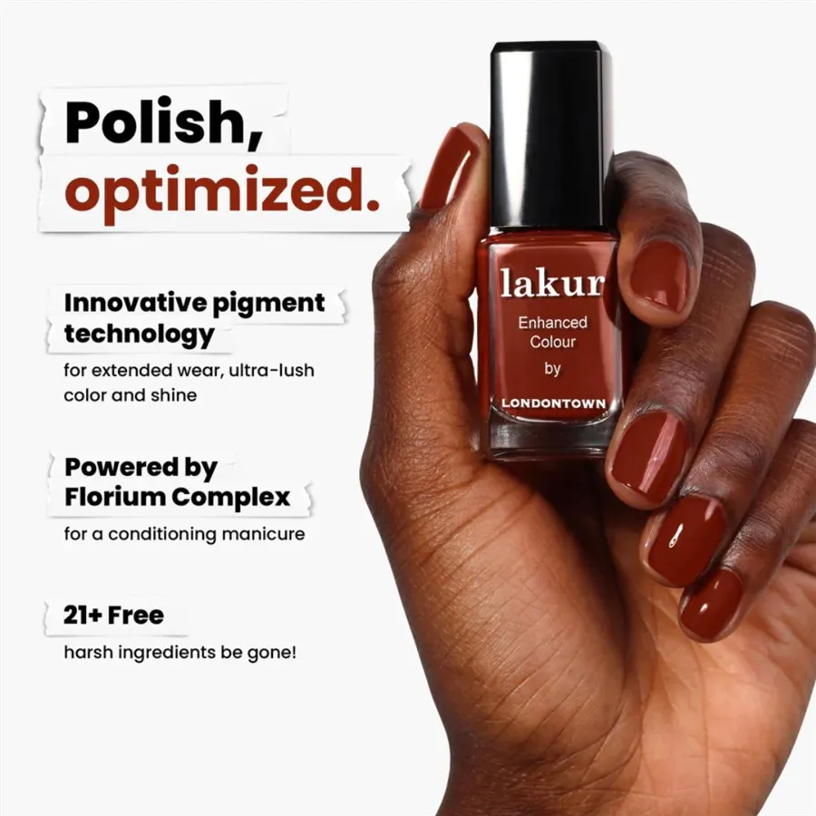 Luxusné laky na nechty Londontown lakur vyživujú a skrášľujú zároveň, pritom sú vysoko odolné, rýchlo schnú a majú takmer gélový lesk. Obsahujú Florium Complex®, starostlivo strážený rodinný recept – zmes botanických olejov a extraktov na posilnenie, hydratáciu a regeneráciu nechtov a pokožky. Laky na nechty lakur predstavujú prelomovú kombináciu intenzívnej farby a jedinečnej starostlivosti kur® – výsledok premysleného prístupu, ktorý spája to najlepšie z čistých ingrediencií a účinnej, profesionálnej technológie. Vyberte si clean beauty.