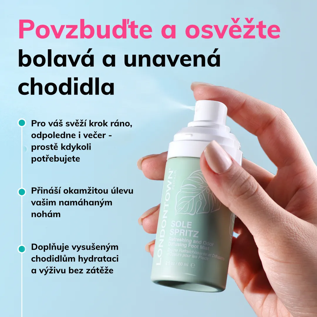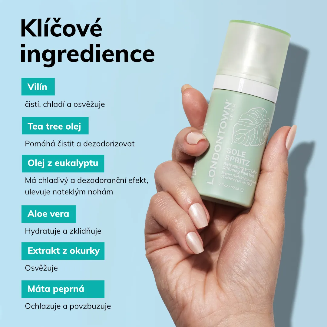Chladivý sprej na nohy Sole Spritz obsahuje osviežujúce rastlinné látky a prirodzene dezodoračné zložky, ako je vilín, čajovníkový olej a eukalyptový olej, ktoré vám pomôžu vykročiť zakaždým tou najlepšou nohou. Používajte ho vždy, keď potrebujete povzbudenie: nastriekajte ho hneď ráno, použite ho na osvieženie po spotenom tréningu, ochlaďte opuchnuté nohy v sparnom dni alebo siahnite po spreji Sole Spritz pred spaním, aby ste uľavili boľavým a unaveným nohám a udržali si pocit čistoty a pohodlia.