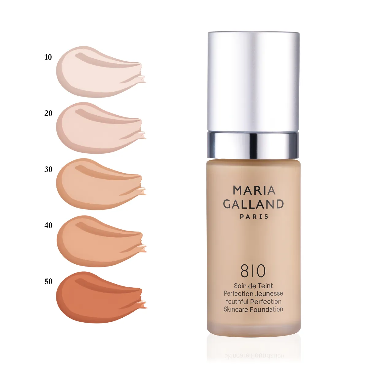 Omladzujúci a ošetrujúci Make-up 810/10 Maria Galland v sebe kombinuje okamžitý aj dlhodobý skrášľujúci efekt. Prejasní pleť, harmonizuje jej odtieň, pôsobí proti starnutiu a zároveň ošetruje pleť. Jemné pigmenty zaisťujú saténový finiš a žiarivý vzhľad. Je vhodný pre ženy so zrelou pleťou, ktoré hľadajú omladzujúce benefity, ideálne tak dopĺňa rady Lift'Expert, Activ'Age a Mille.