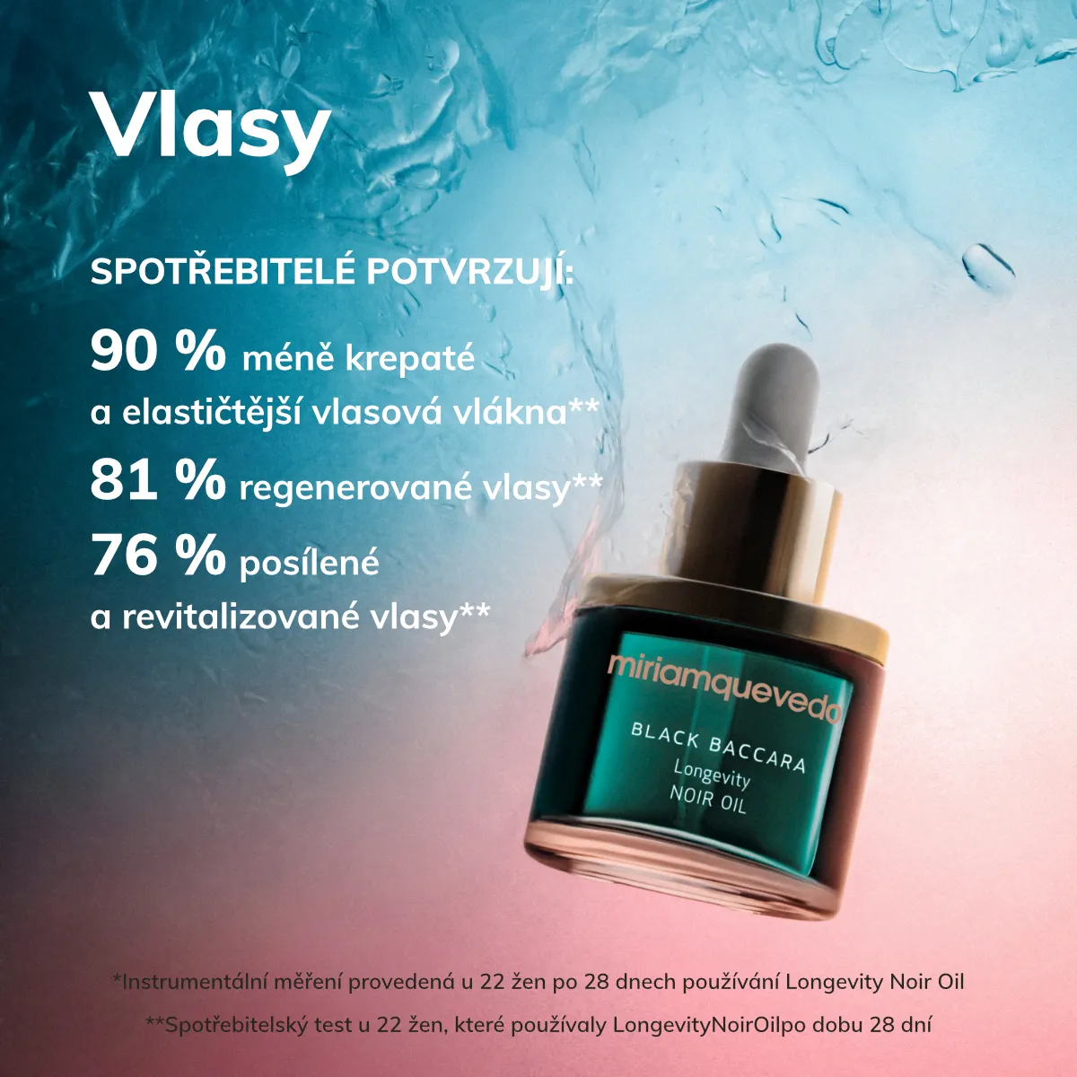 Black Baccara Longevity Noir Oil od Miriam Quevedo je prémiový suchý olej určený na celostnú anti aging starostlivosť o pleť, pokožku hlavy aj vlasy. Tento elixír bunkovej dlhovekosti spája pokročilú biotechnológiu s unikátnou zmesou 15 vzácnych olejov a prírodných extraktov. Je navrhnutý tak, aby pôsobil ako antistresová kúra, ktorá neutralizuje účinky kortizolu, obnovuje prirodzené cirkadiánne rytmy a podporuje regeneráciu buniek.