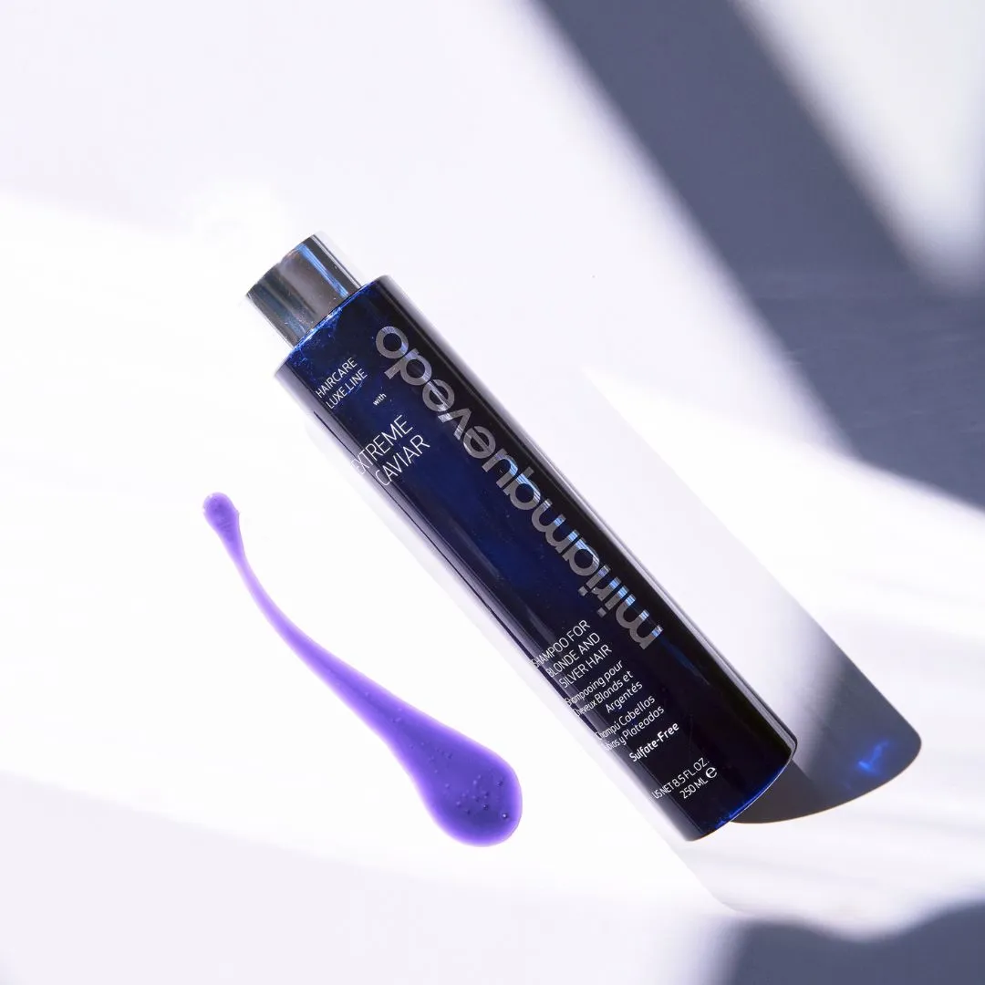 Extreme Caviar Shampoo pre blond a strieborné vlasy je sofistikovaný šampón navrhnutý tak, aby staral o svetlé, odfarbené alebo prirodzene šedivé vlasy. Okamžite ich rozjasňuje, hydratuje a omladzuje. Jeho fialové pigmenty účinne neutralizujú žlté a mosadzné podtóny. Regeneračné zloženie obnovuje štruktúru vlasov a zanecháva ich žiarivé, jemné a plné vitality.