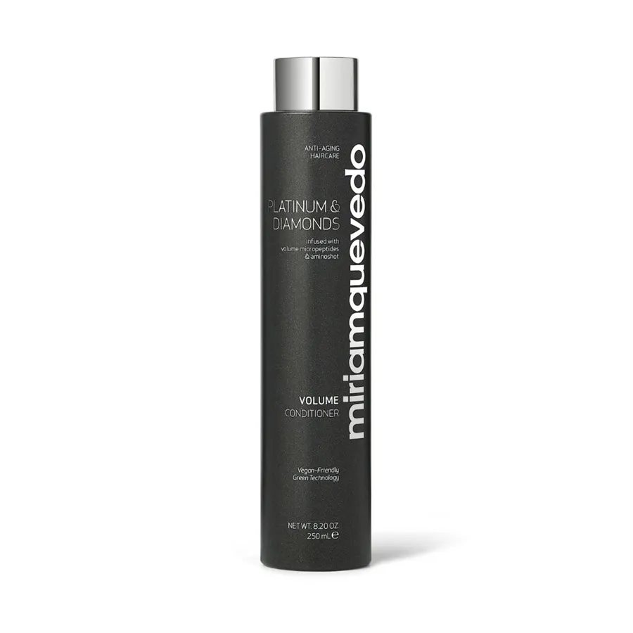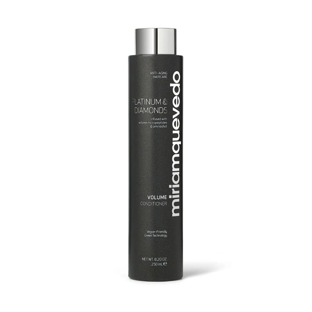 Platinum & Diamonds Volume Conditioner od Miriam Quevedo je ultra-obnovujúci objemový kondicionér s pokročilým anti-aging účinkom. Obsahuje 22 vzácnych aktívnych zložiek, ktoré obnovujú objem zvnútra vlasového vlákna aj na jeho povrchu, pričom zároveň pôsobia proti starnutiu pokožky hlavy, vlasových folikulov aj samotných vlasov. Dodáva vlasom oslnivý lesk vďaka obsahu platinového a diamantového prášku, hĺbkovo hydratuje, skrášľuje a chráni. Vlasy sú po použití výnimočne hebké a bohaté. Intenzívne vyživuje, uľahčuje rozčesávanie a viditeľne zlepšuje ovládateľnosť vlasov, čím podporuje ich mladistvý vzhľad. Zjemňuje, zvyšuje pružnosť a zabraňuje lámaniu. Elegantná textúra a svieža vôňa vytvárajú pocit profesionálnej starostlivosti pri každej aplikácii.
