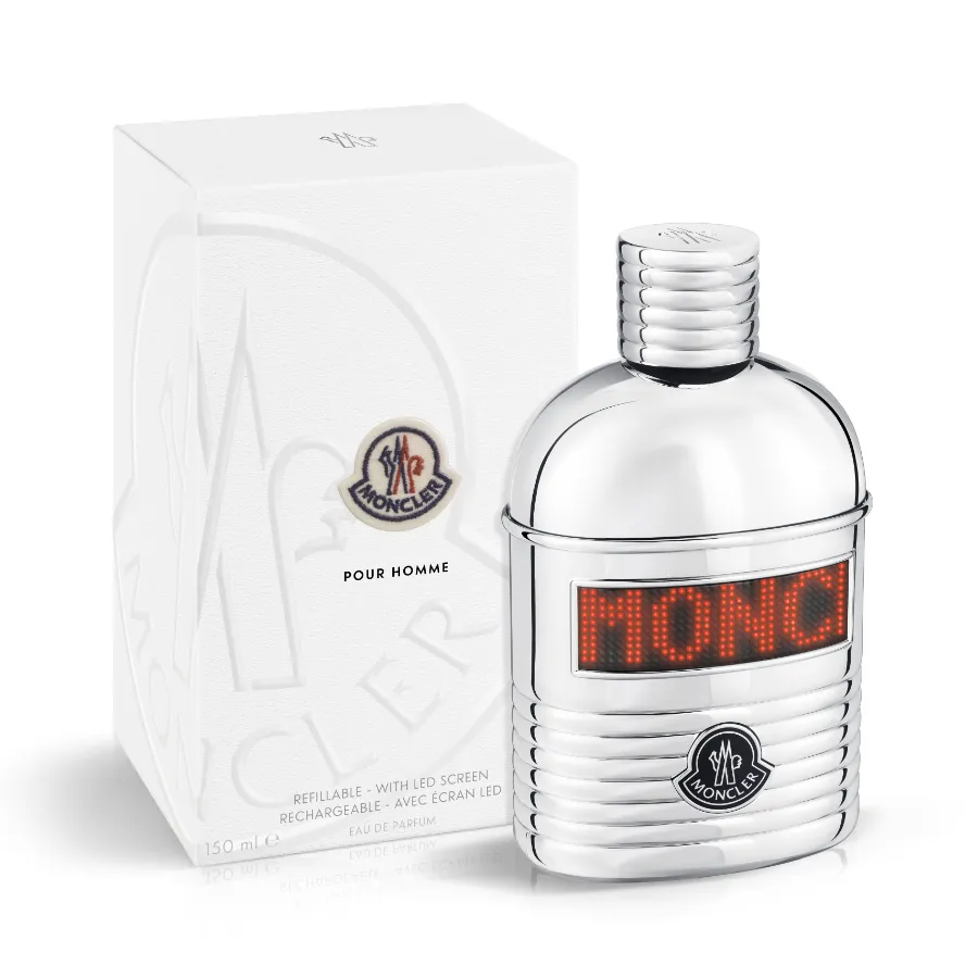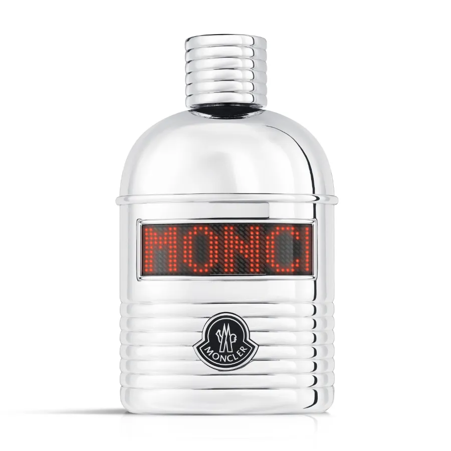 Flakón v rovných líniách má odvážny strieborný efekt a jemne zakrivený design do tvaru "borraccia". Je obklopený rebrovaným strieborným puzdrom a uzáverom. Flakón je zabalený v prémiovej matnej krabičke s ikonickým logom Moncler a s charakteristickou nášivkou "feltrino", ktorá pripomíná nášivku na páperových bundách Moncler.