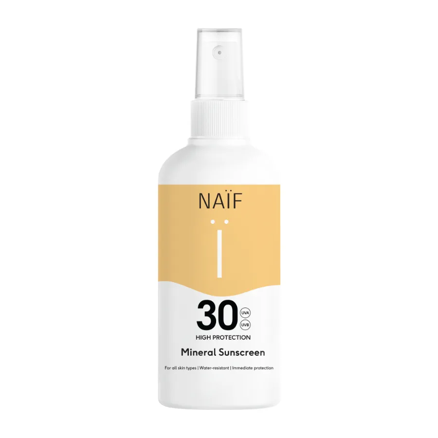 Naïf Ochranný krém na opaľovanie SPF 30 v spreji (Mineral Sunscreen Spray SPF 30) s minerálnym zložením v podobe oxidu zinočnatého bez nanočastíc (Zinc Oxide non nano) účinne chráni pred UVA i UVB žiarením. Je vodoodolný a pokožka je chránená okamžite po aplikácii (nie je potrebné čakať, kým krém začne plniť svoju funkciu).