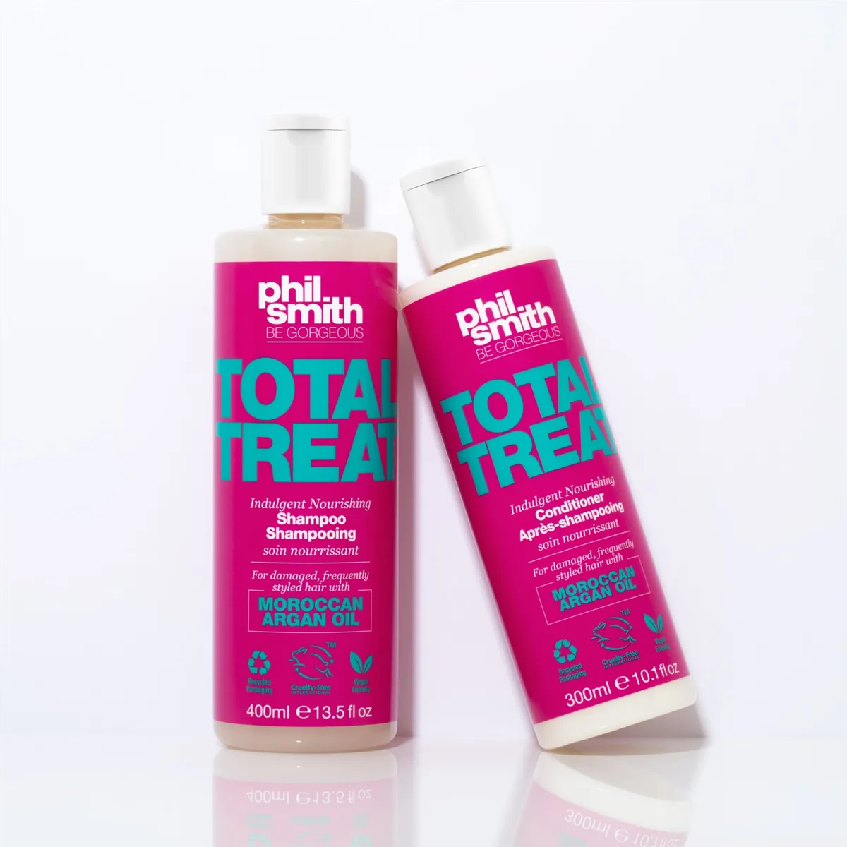 Kondicionér na vlasy Phil Smith Be Gorgeous Total Treat zachráni poškodené a suché vlasy. Marocký arganový olej pomáha vlasy znova vyživovať a navyše ich chráni pred tepelným poškodením. Vaše vlasy budú naviac žiarivo lesklé a hebké. S radom Total Treat dáte raz a navždy zbohom suchým a poškodeným vlasom. Je skvelý pre farbené vlasy. Chráni ich pred tepelným poškodením a dodá im žiarivý lesk.