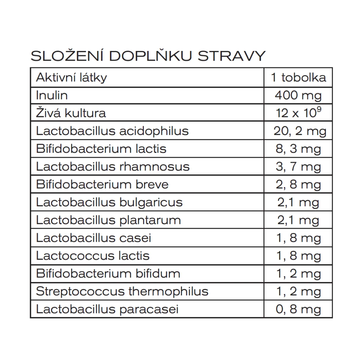Inulin, Lactobacillus acidophilus, Bifidobacterium lactis, Lactobacillus rhamnosus, Bifidobacterium breve, Lactobacillus bulgaricus, Lactobacillus plantarum, Lactococcus lactis, Lactobacillus casei, Bifidobacterium bifidum, Streptococcus thermophilus, Lactobacillus paracasei, Stearan hořečnatý (plnidlo), želatinová tobolka