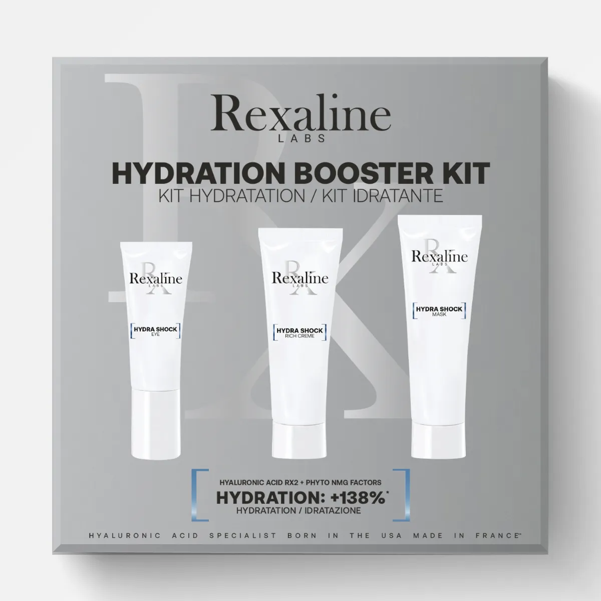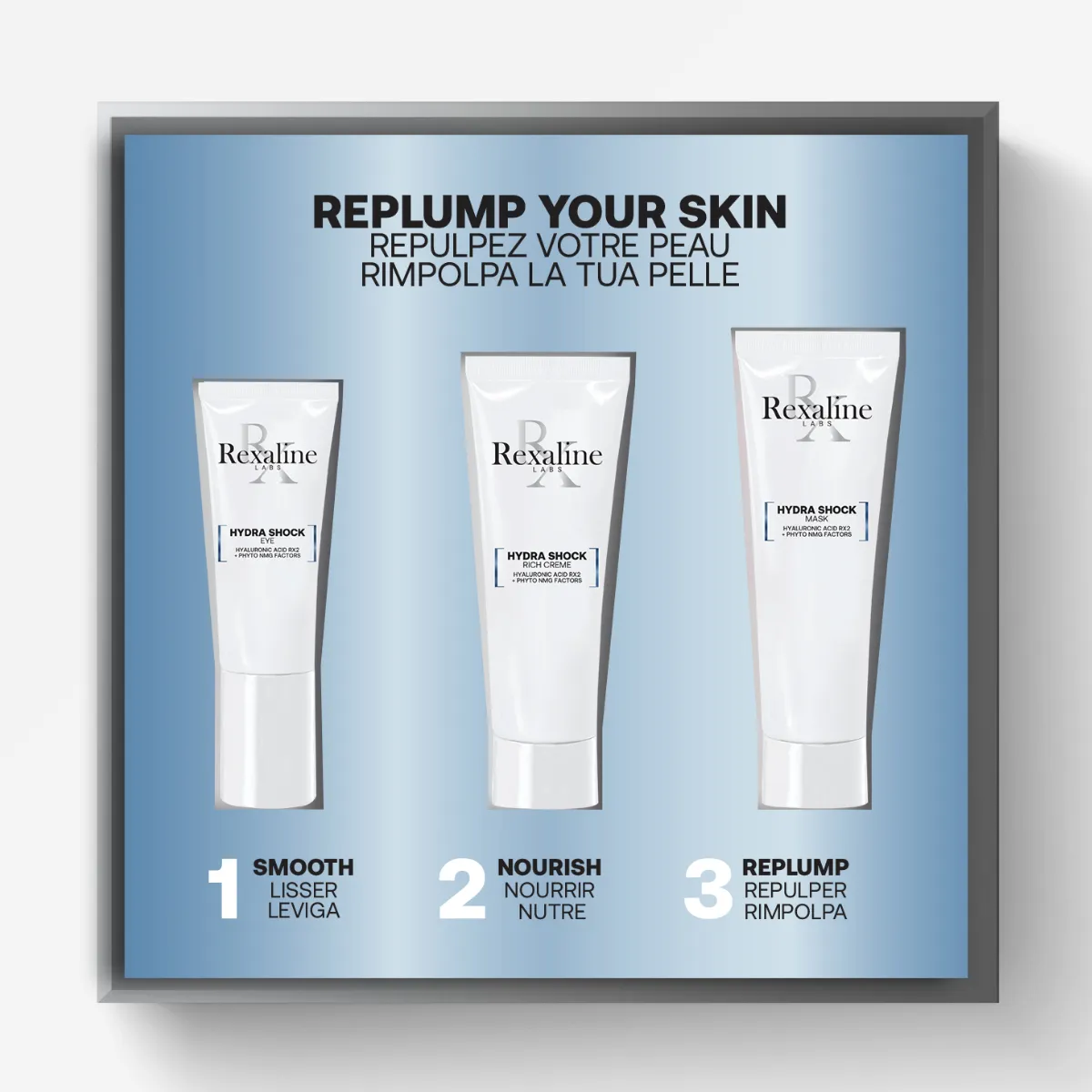 Hydra Shock Bohatý hydratační krém: Aqua, Dimethicone, Glycerin, Polysilicone-11, Helianthus Annuus (Sunflower) Seed Oil, Behenyl Alcohol, PEG-10 Dimethicone, Propylheptyl Caprylate, Pentylene Glycol, Cetearyl Alcohol, Isononyl Isononanoate, Phenoxyethanol, Glyceryl Stearate, Hydrogenated Lecithin, PEG-100 Stearate, Ammonium Acryloyldimethyltaurate/Beheneth-25 Methacrylate Crosspolymer, Cetearyl Glucoside, Sodium PCA, Caprylyl Glycol, Cyclodextrin, Hydrolyzed Lupine Protein, Parfum (Fragrance), Sodium Hyaluronate, Sodium Lactate, Adenium Obesum Leaf Cell Extract, BHT, Xanthan Gum, Divinyldimethicone/Dimethicone Crosspolymer, Propanediol, Disodium EDTA, O-Cymen-5-Ol, Tetrahydroxypropyl Ethylenediamine, Adenosine, Myrtus Communis Leaf Extract, Butylene Glycol, Glucose, Hyaluronic Acid, Phenethyl Alcohol, Titanium Dioxide, Sodium Carrageenan, Ulmus Davidiana Root Extract, Sodium Benzoate, Ethylhexylglycerin, Salvia Sclarea (Clary) Extract, Malus Domestica Fruit Cell Culture Extract, Maris sal/ Sea Salt/ Sel marin, Potassium Sorbate, Citric Acid, Lecithin, Sodium Chloride, Sodium Sulfate, CI 16035 (Red 40), CI 42090 (Blue 1 Lake)