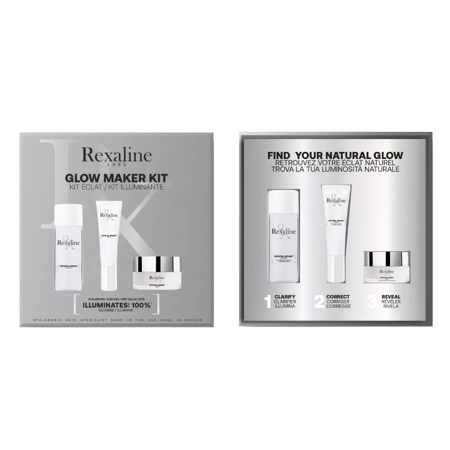 Cestovný set pre rozjasnenú pleť obsahuje produkty z rady Crystal Bright. Dvojitá kyselina hyalurónová, ktorá je súčasťou zloženia všetkých produktov Rexaline, dodáva intenzívnu dávku hydratácie všetkým vrstvám pleti. Viditeľne vyhladzuje vrásky a obnovuje pružnosť pleti. Rozjasňuje a odstraňuje nepríjemné pocity pnutia, ktoré sú jedným zo základných prejavov dehydratácie. Výrobky Crystal Bright obsahujú aj 3Bright (kyselinu galovú).